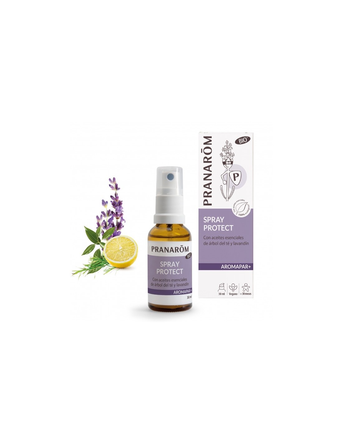 Con aceites esenciales 100% ecológicos* : Lavandín, Árbol del té, Ylang-ylang, Limón, Ravintsara, Niaulí, Clavo de especias, Orégano