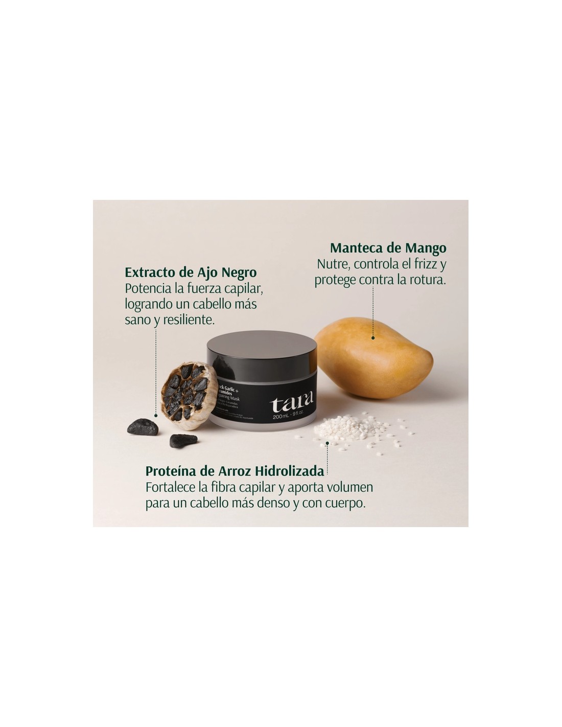 La Mascarilla Reparadora Ajo Negro + Ceramidas de TARA está diseñada para revitalizar, reconstruir y fortalecer la fibra capilar desde el interior. Formulada con Extracto de Ajo Negro ABG10+® —un complejo antioxidante de alta eficacia— y Ceramidas biomiméticas que reparan la barrera natural del cabello, este tratamiento intensivo reduce la rotura, mejora la elasticidad y protege frente al daño térmico, químico y ambiental.