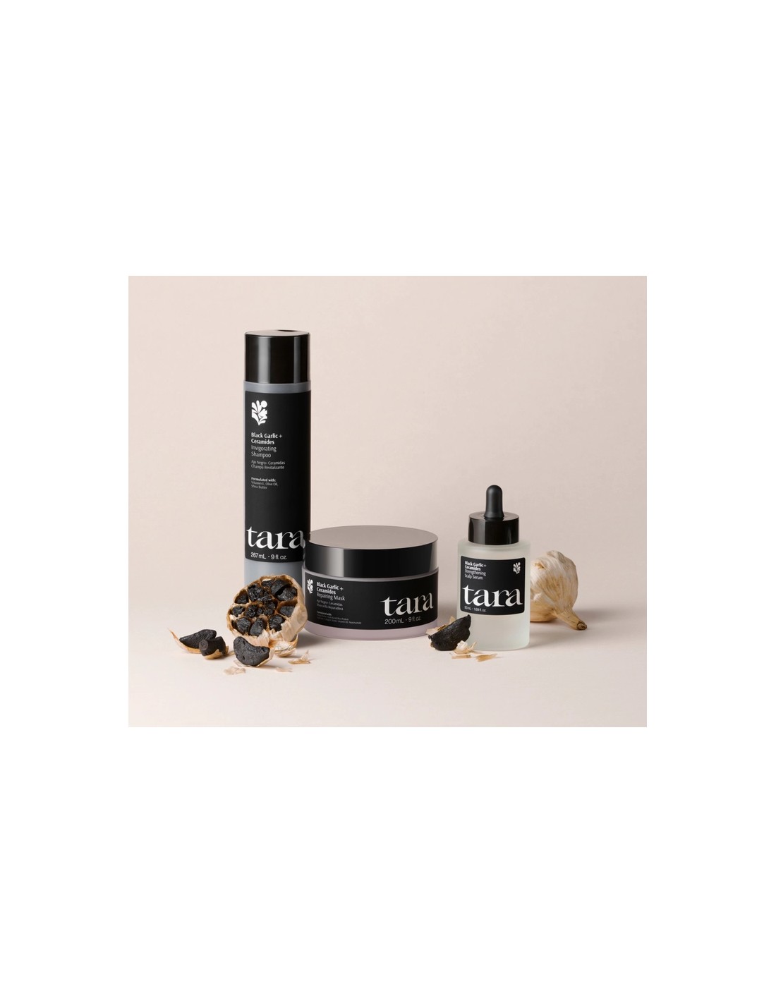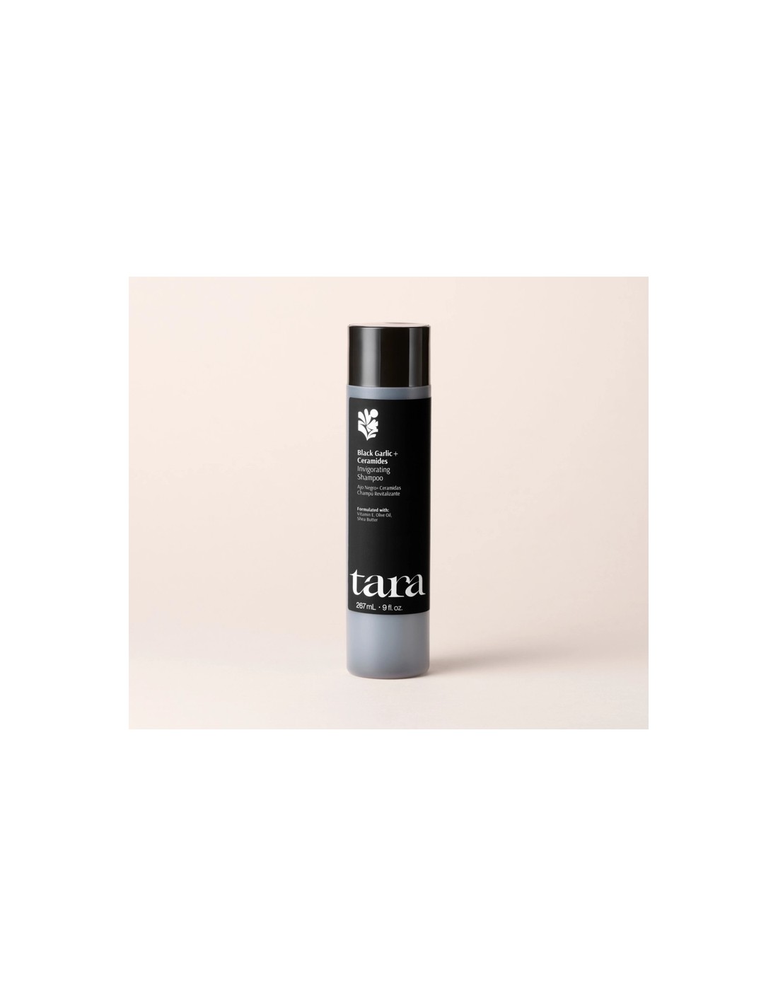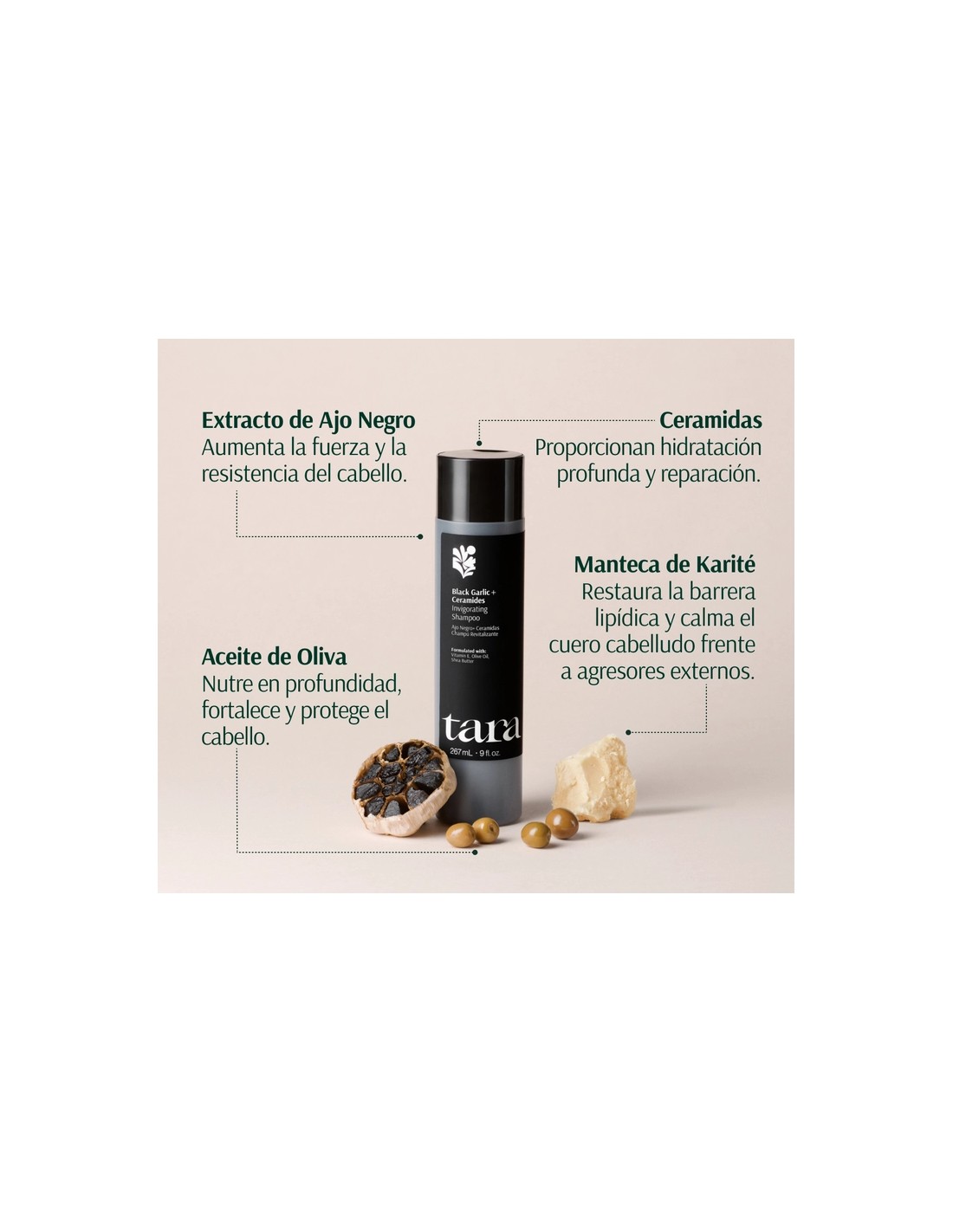 El Champú Revitalizante Ajo Negro + Ceramidas de TARA es una fórmula avanzada, sin sulfatos, diseñada para revitalizar el cuero cabelludo y fortalecer el cabello desde la raíz. Combina el poder del extracto de Ajo Negro ABG10+®, reconocido por su acción antioxidante y energizante, con Ceramidas biomiméticas que restauran la barrera natural del cuero cabelludo y protegen la fibra capilar. Su mezcla nutritiva con Vitamina E, Aceite de Oliva y Manteca de Karité aporta hidratación profunda, suavidad y brillo, dejando el cabello más fuerte, manejable y visiblemente saludable desde el primer uso.
