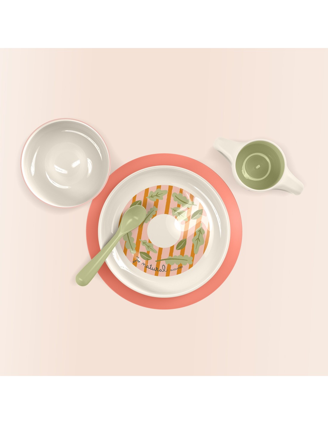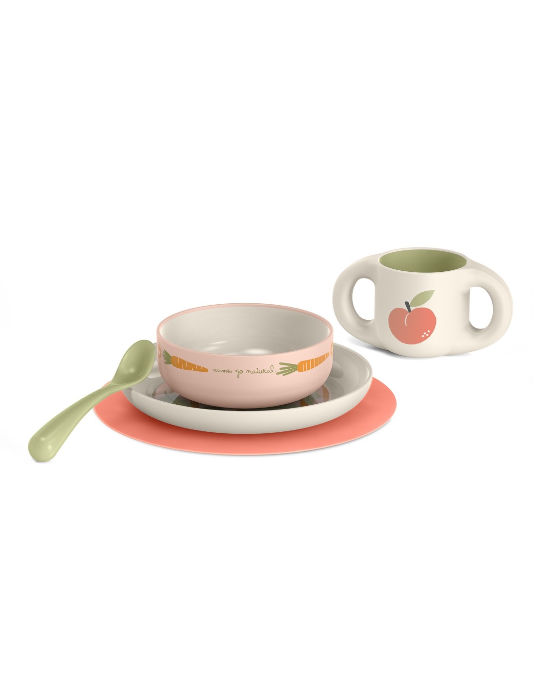 Vajilla compuesta por plato llano y bol de gran capacidad, taza con grandes asitas que facilitan su agarre, cuchara ergonómica ideal para papillas y potitos y mantel antideslizante que evita que el plato se mueva.