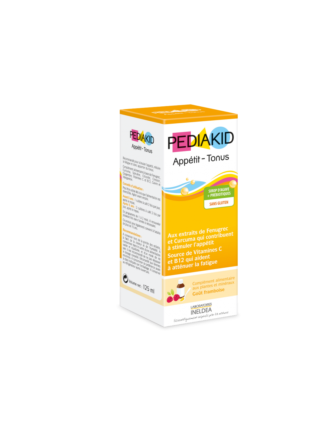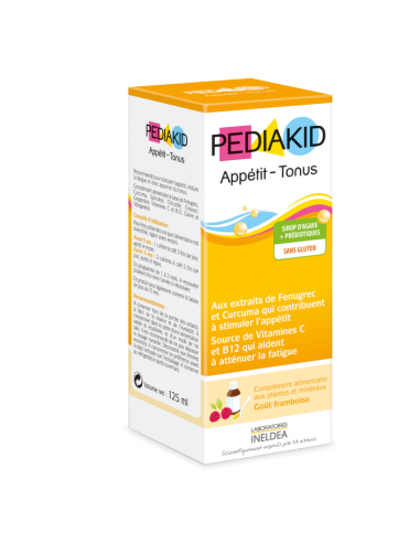 Especialmente recomendado para los niños que se pelean con el plato de comida cada día, PEDIAKID® Apetito-Tono combina ingredientes naturales eficaces para estimular el apetito y ayuda en el aumento de peso, fenogreco y cúrcuma, vitaminas C y B12 para reducir la fatiga, para una mayor energía.