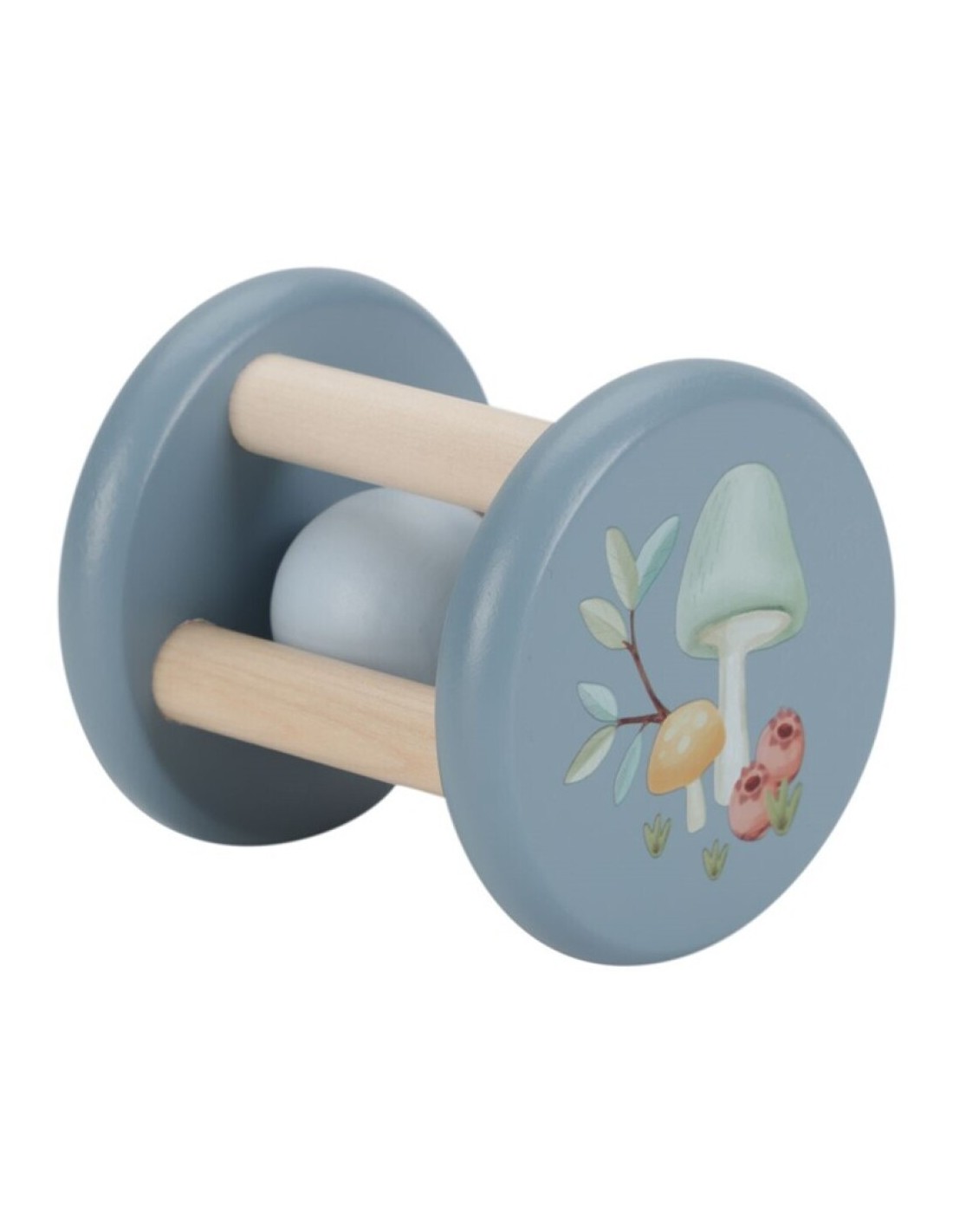 Sus lados azules muestran una ilustración de la colección Forest Friends, que presenta un par de setas mágicos ubicados en el corazón de un bosque encantado. Diseñado para promover la coordinación mano-ojo, este sonajero tiene el tamaño perfecto para que las pequeñas manos lo agarren y exploren.