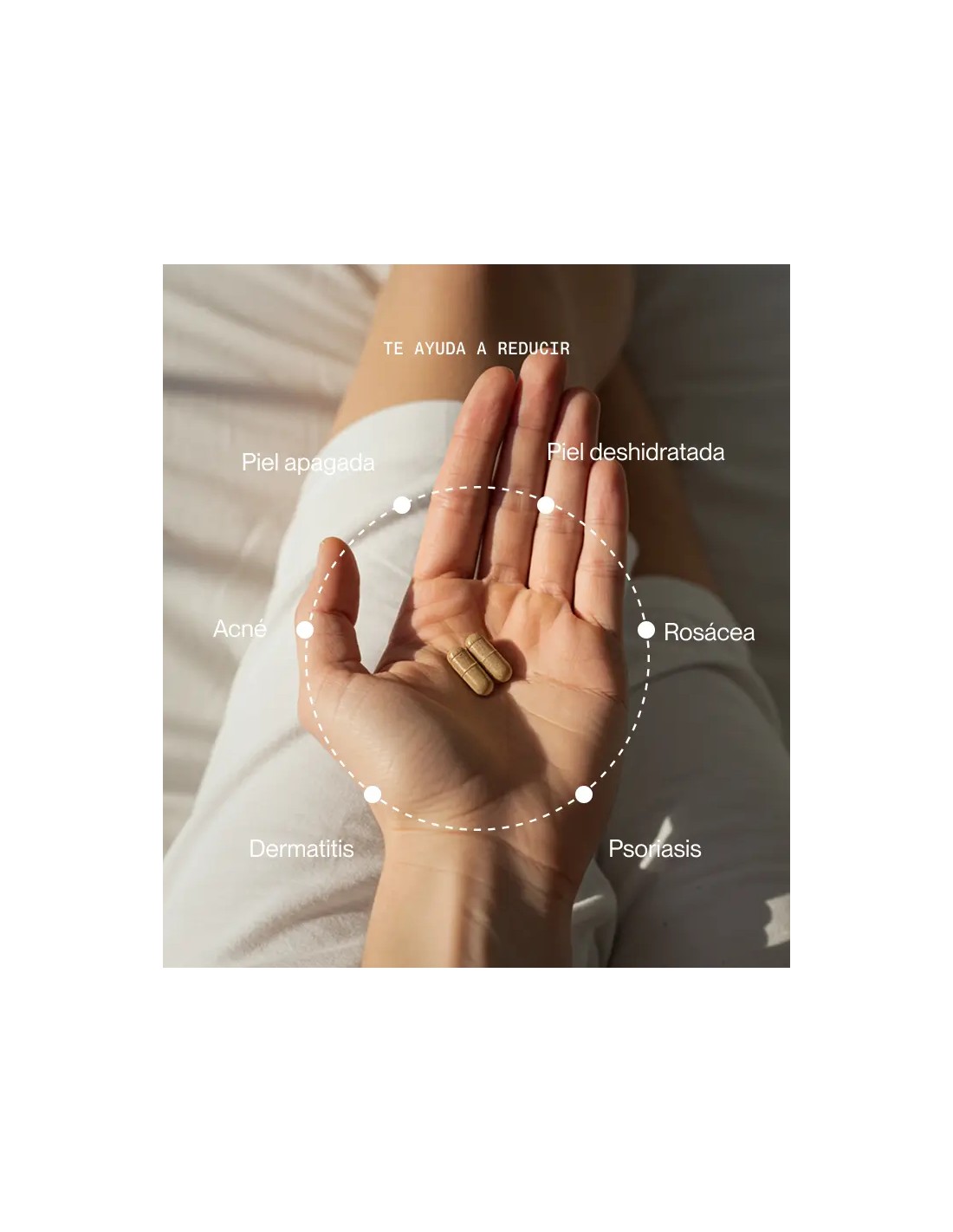 Apoya al organismo a combatir los efectos dañinos del sol y afecciones de la piel como acné, psoriasis o melasma.