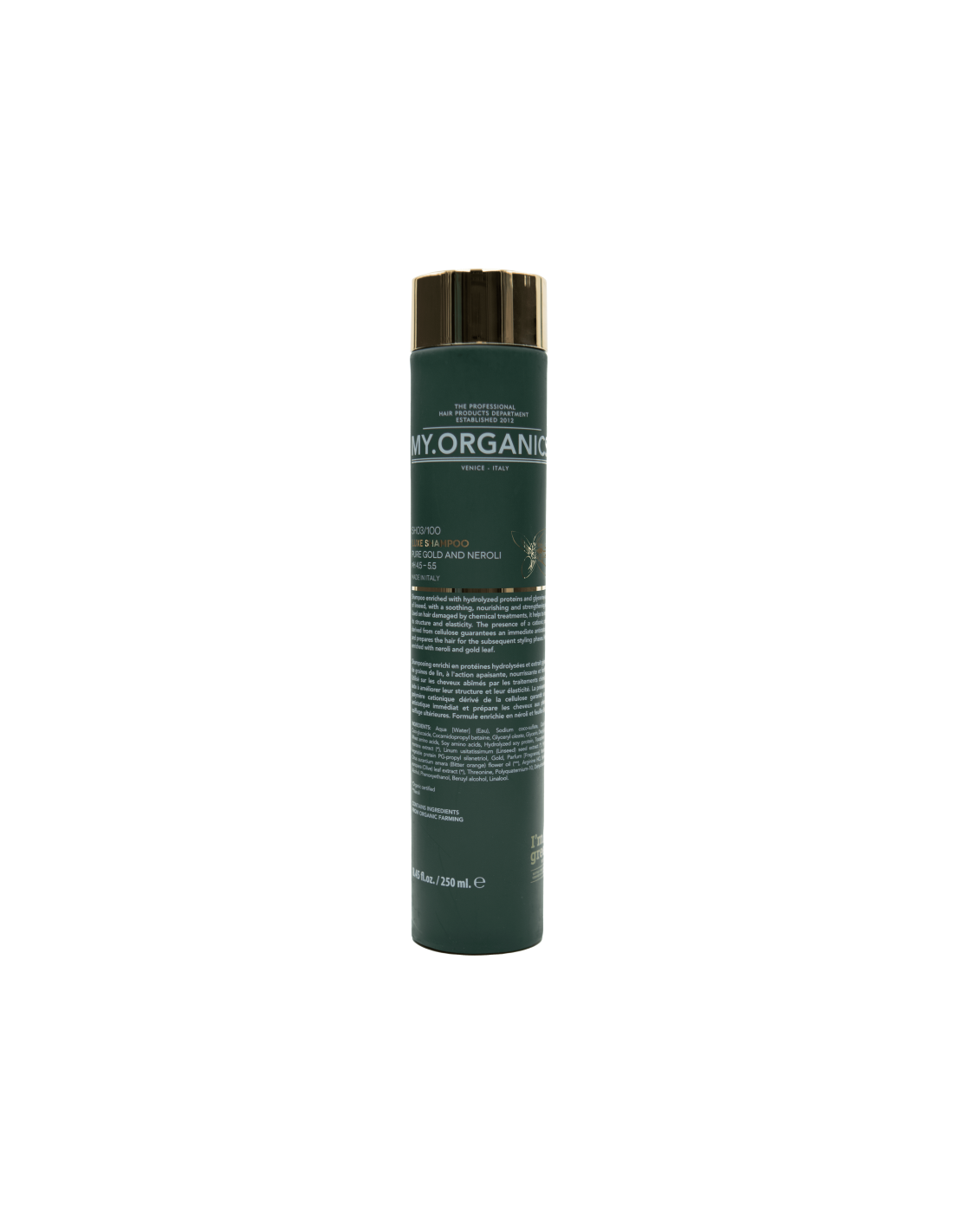 Aqua [Water] (Eau), Sodium coco-sulfate, Coco-betaine, Coco-glucoside, Cocamidopropyl betaine, Glyceryl oleate, Glycerin, Decyl glucoside, Wheat amino acids, Soy amino acids, Hydrolyzed soy protein, Tocopherol, Arnica montana extract (), Linum usitatissimum (Linseed) seed extract (), Hydrolyzed vegetable protein PG-propyl silanetriol, Gold, Parfum [Fragrance], Benzoic acid, Citrus aurantium amara (Bitter orange) flower oil(), Arginine HCl, Serine, Olea europaea (Olive) leaf extract (), Threonine, Polyquaternium-10, Dehydroacetic acid, Alcohol, Phenoxyethanol, Benzyl alcohol, Linalool. Organic certified Neroli.