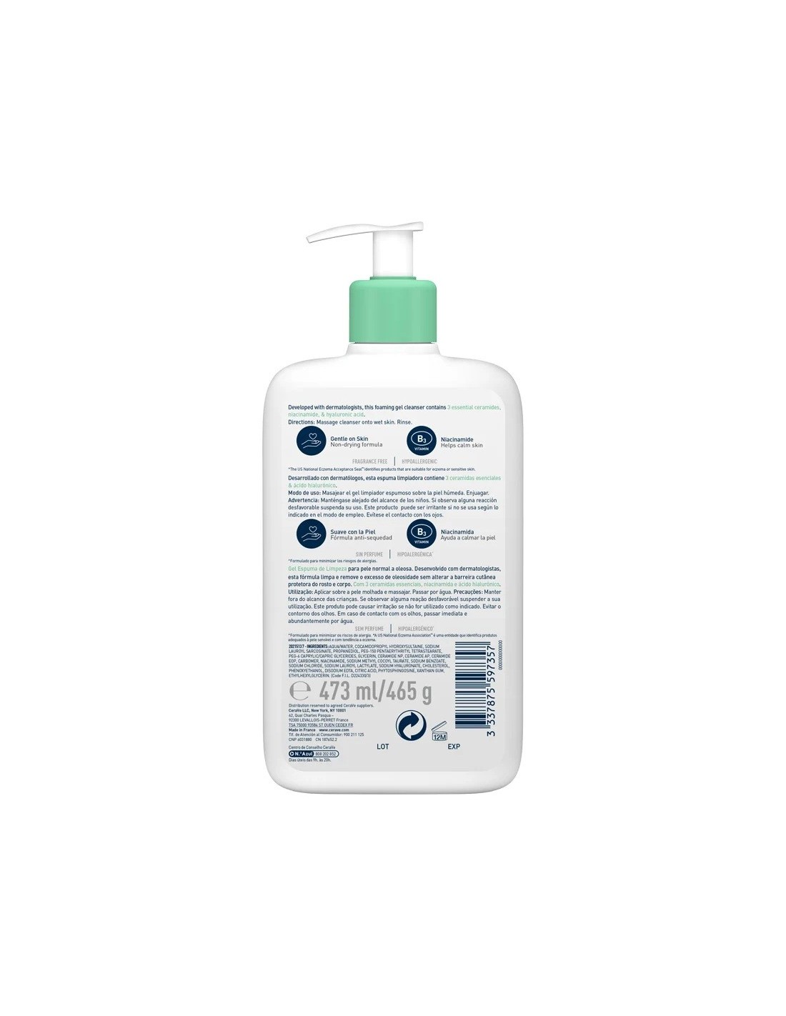 El Gel Limpiador Espumoso de CeraVe contiene 3 ceramidas esenciales, ácido hialurónico y niacinamida para ayudar a preservar la barrera protectora de la piel, hidratar y calmar la piel.