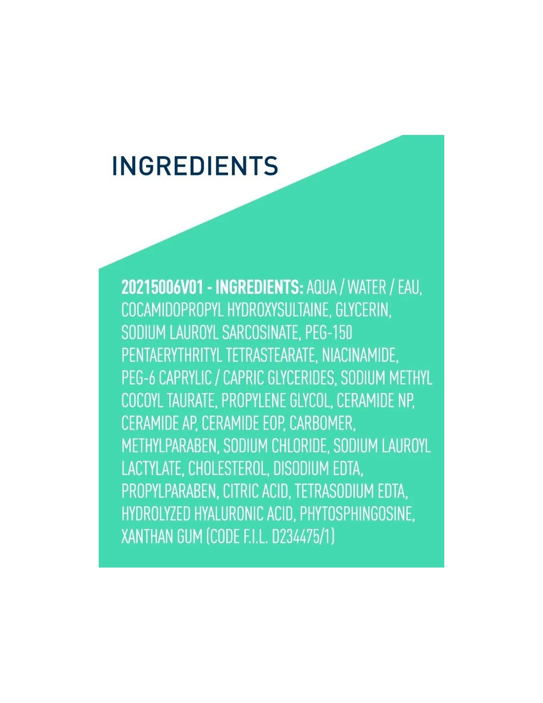 AQUA / WATER ●COCAMIDOPROPYL HYDROXYSULTAINE ●GLYCERIN ●SODIUM LAUROYL SARCOSINATE ●PROPANEDIOL ●PEG-150 PENTAERYTHRITYL TETRASTEARATE ●NIACINAMIDE ●PEG-6 CAPRYLIC/CAPRIC GLYCERIDES ●CERAMIDE NP ●CERAMIDE AP ●CERAMIDE EOP ●CARBOMER ●SODIUM METHYL COCOYL TAURATE ●SODIUM BENZOATE ●SODIUM CHLORIDE ●SODIUM LAUROYL LACTYLATE ●SODIUM HYALURONATE ●CHOLESTEROL ●PHENOXYETHANOL ●DISODIUM EDTA ●CITRIC ACID ●TETRASODIUM EDTA ●PHYTOSPHINGOSINE ●XANTHAN GUM ●ETHYLHEXYLGLYCERIN ●