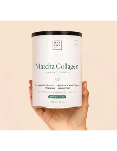 Suplemento dietético de alta calidad que combina cuatro ingredientes esenciales para mejorar la salud de la piel, los huesos y los tendones: péptidos de colágeno, magnesio, ácido hialurónico y té matcha.