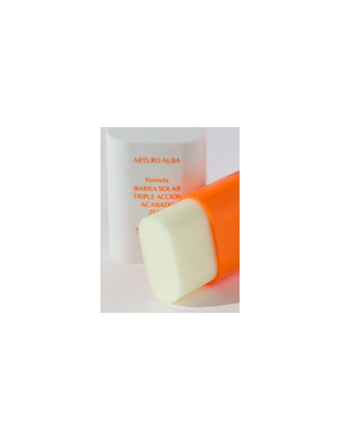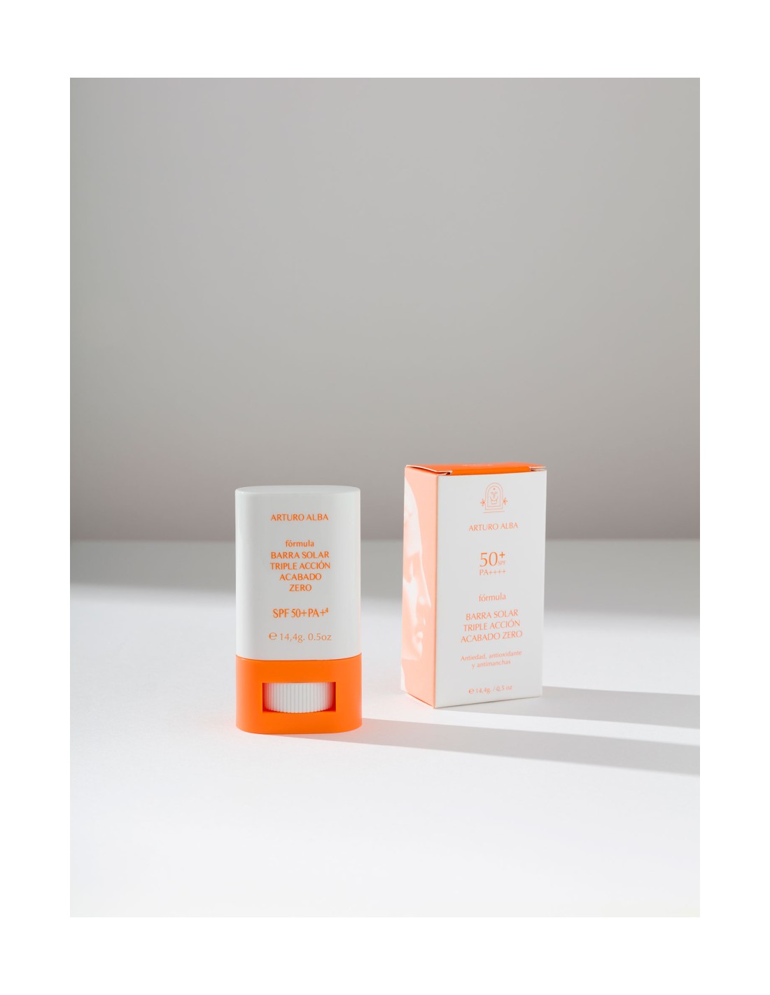 La Barra Solar Triple Acción SPF 50+ PA++++ de Arturo Alba combina la sofisticación de la alta cosmética con la máxima exigencia en fotoprotección avanzada. Su fórmula inteligente protege la piel frente a la radiación UVA/UVB, ayudando a prevenir el fotoenvejecimiento, la pérdida de firmeza y la aparición de manchas.