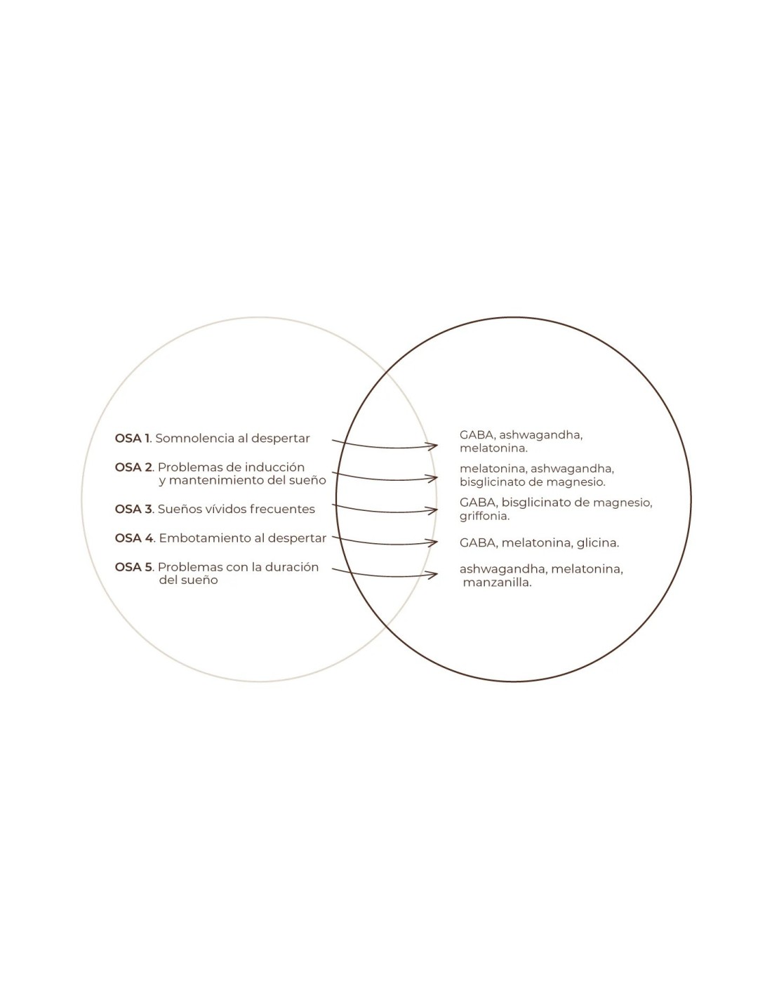 NEURO SLEEP combina los compuestos activos más potentes para equilibrar los 5 factores OSA, descritos en el Cuestionario de Sueño de Oguri-Shirakawa-Azumi (ver en fotos) , una herramienta que evalúa la calidad del descanso y detecta los distintos tipos de problemas del sueño. Estos factores pueden presentarse de forma individual o conjunta.