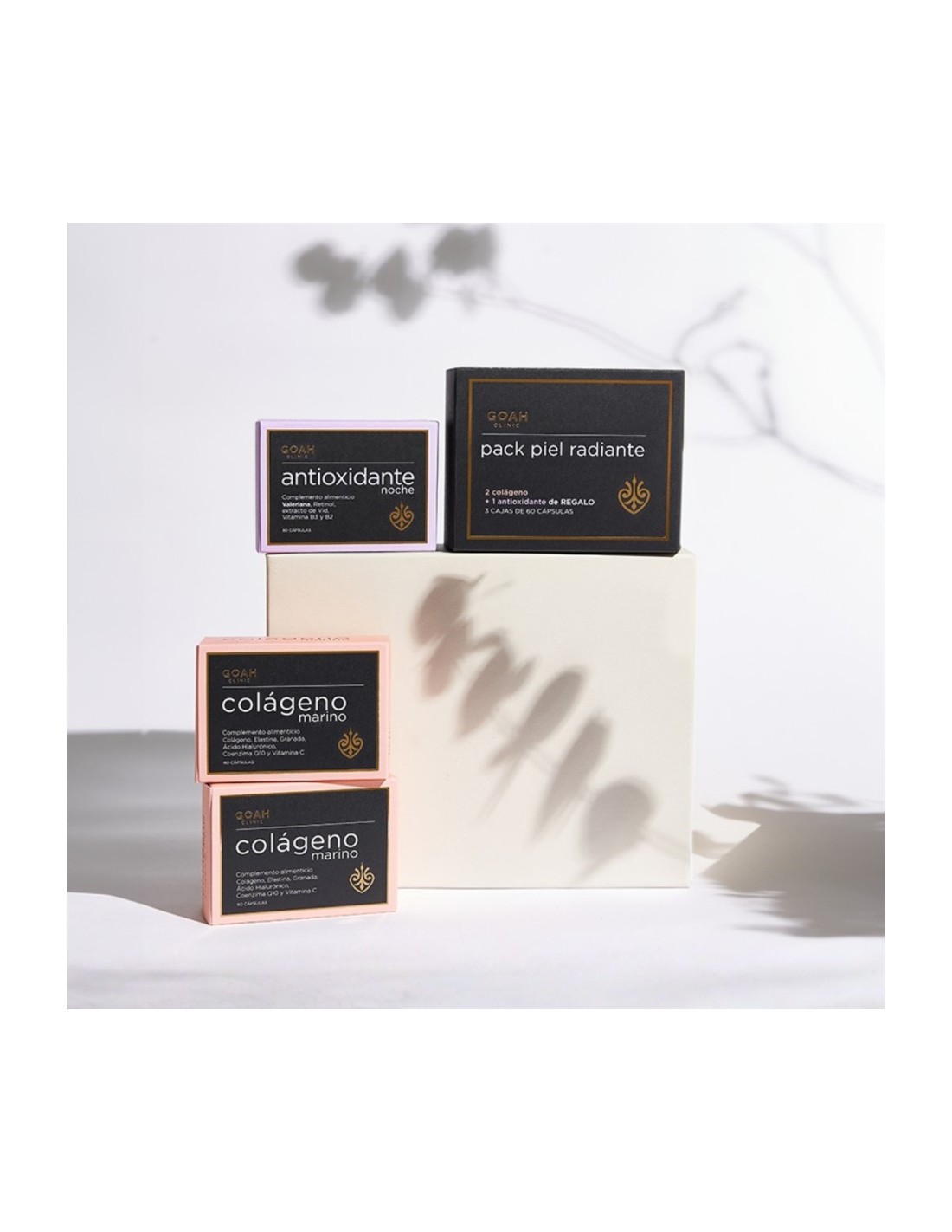 GOAH CLINIC PACK PIEL RADIANTE es un tratamiento de nutricosmética que combina dos fórmulas complementarias para el cuidado de la piel desde el interior: Colágeno Marino y Antioxidante Noche.