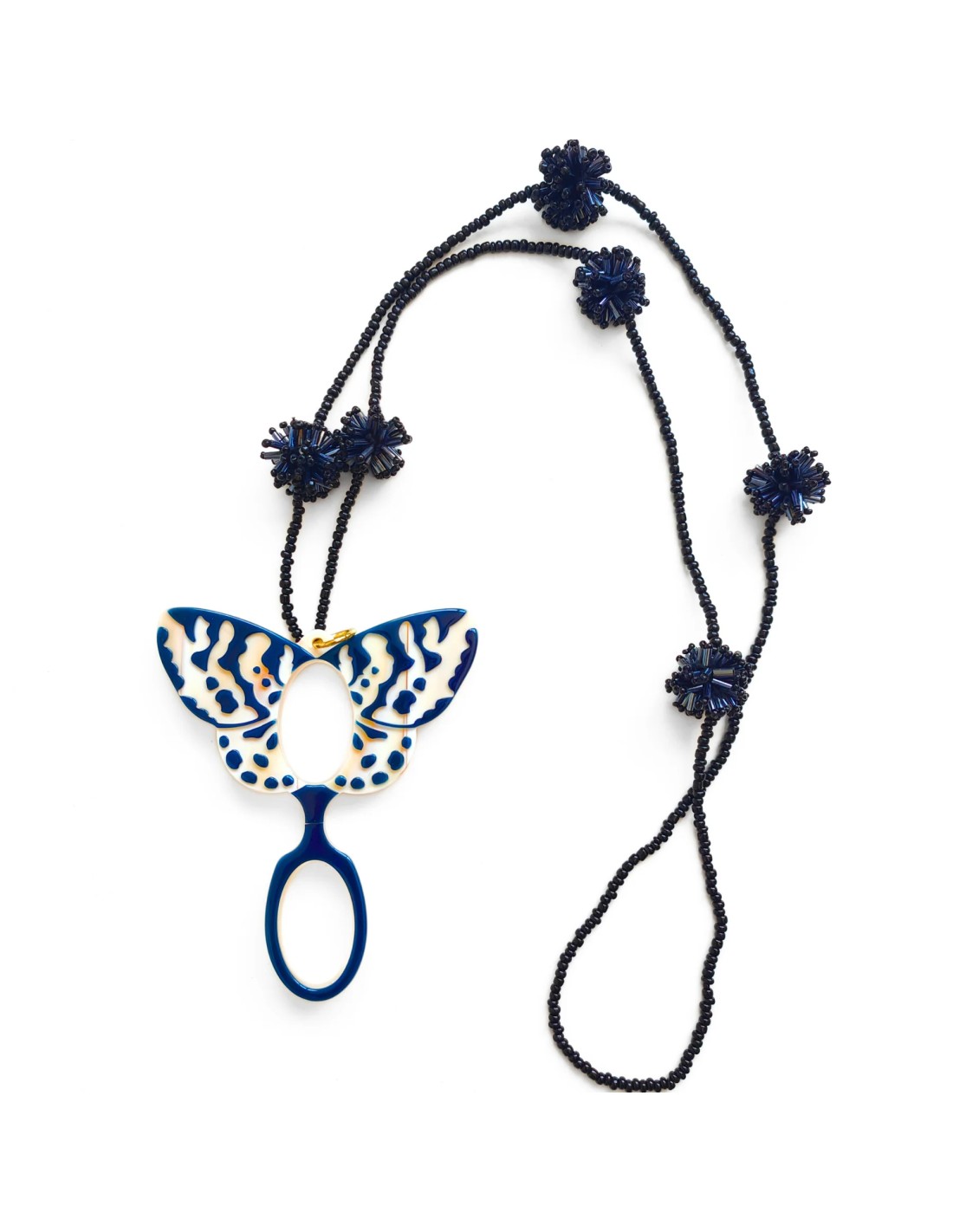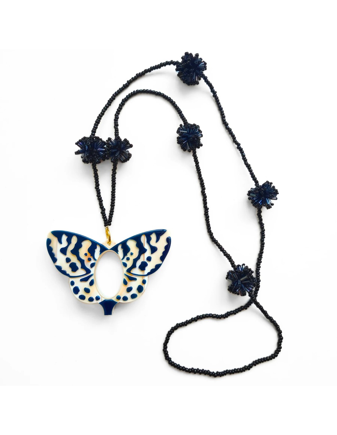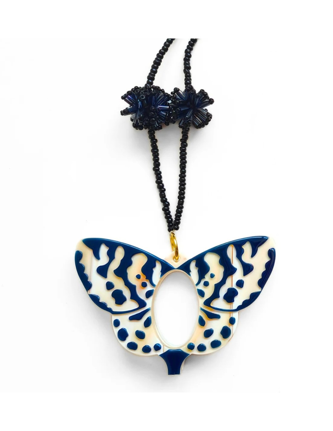 El intrincado tallado en acetato crea un contraste elegante entre capas, reproduciendo la belleza y detalle de las alas de la mariposa. En tonos azul marino y hueso, acompañado de un collar de bolitas y pompones de cristal negro, es el accesorio perfecto para completar cualquier look con un toque artístico y sofisticado. 🖤💙
