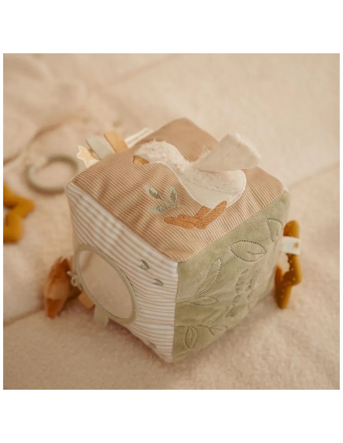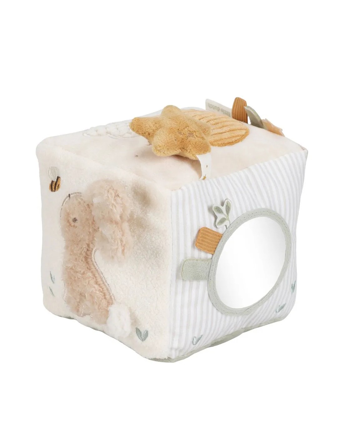El cubo incluye múltiples elementos sensoriales —sonajero, texturas, etiquetas, solapas y un espejo seguro— pensados para estimular los sentidos desde las primeras etapas. Su tacto blandito y su formato fácil de sujetar invitan a explorar, agitar, morder y girar, fomentando el desarrollo de la motricidad fina y la coordinación ojo-mano.