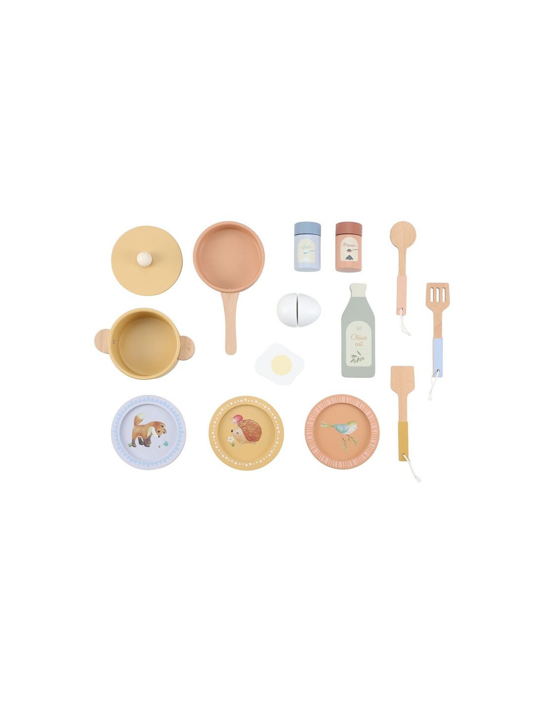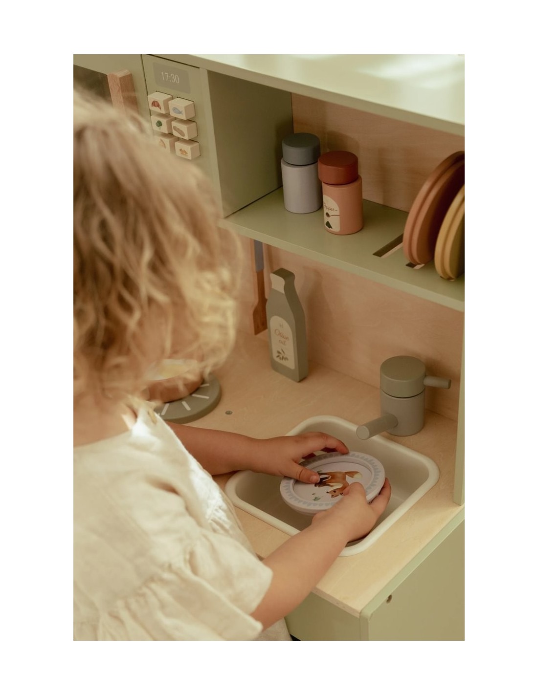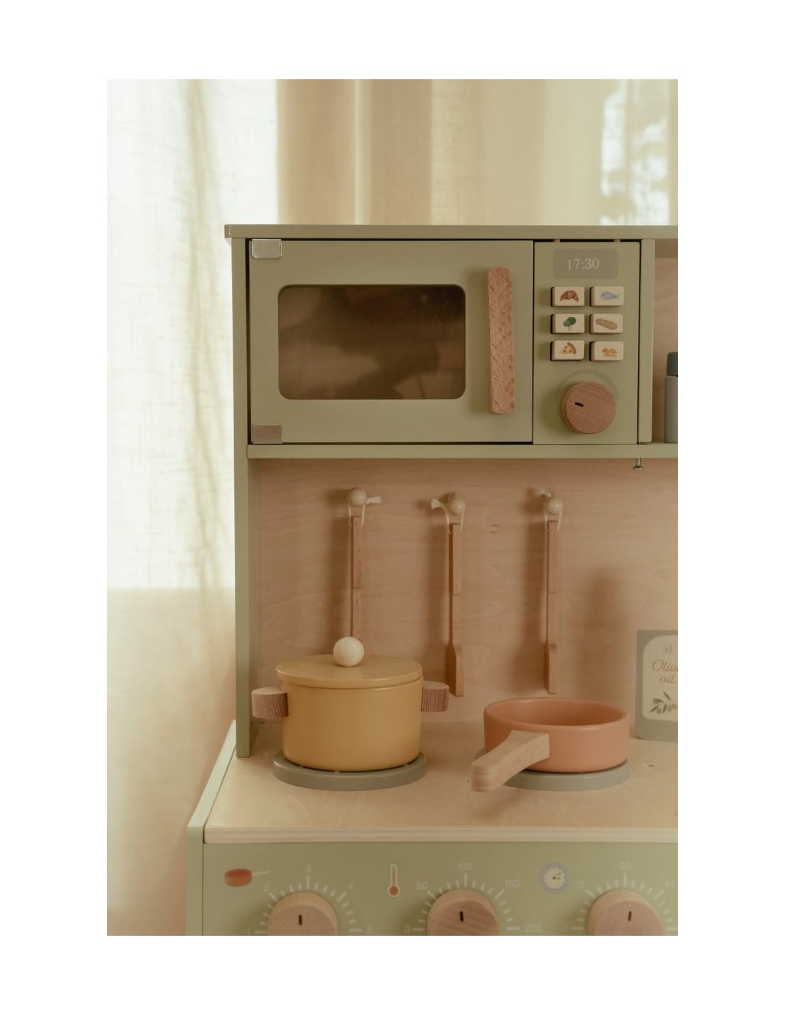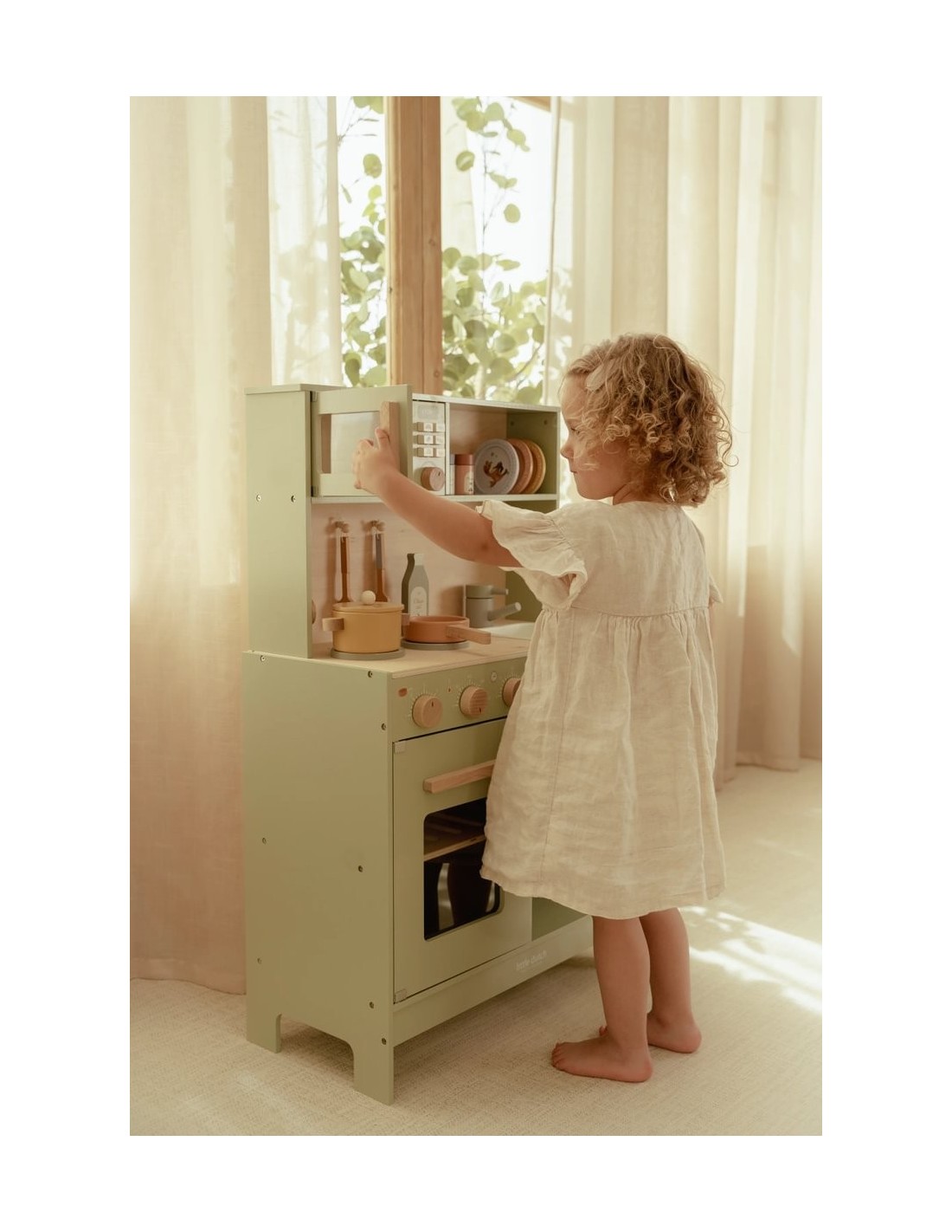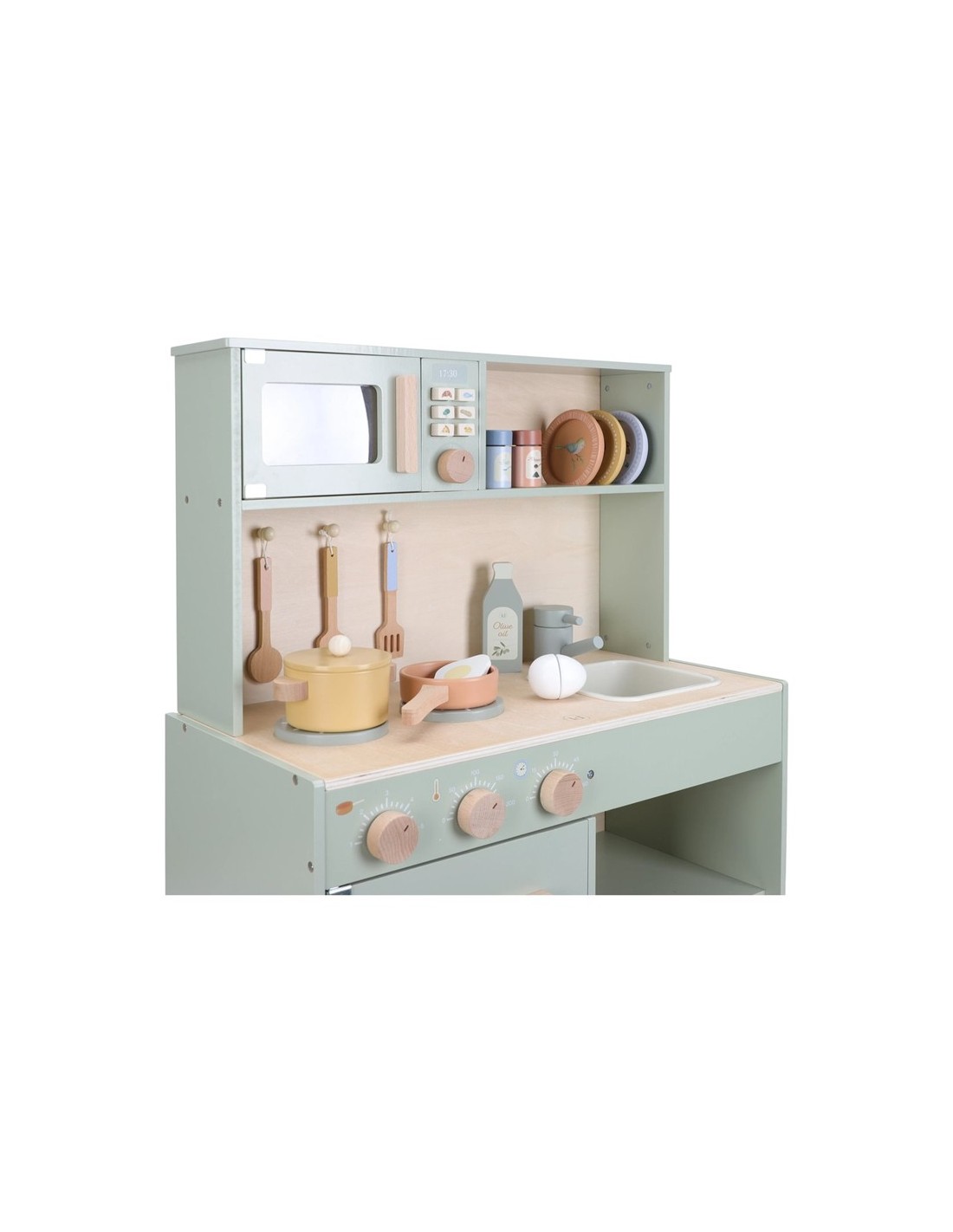 ¡Los pequeños chefs pueden ponerse manos a la obra en esta preciosa cocina de juguete de madera color menta! Hornean un delicioso pastel, cocinan verduras frescas en el horno o fríen un huevo en la sartén. La cocina está completamente equipada con dos sartenes, utensilios de cocina, tres platos y un fregadero para lavarse las manos. También incluye una botella de aceite de oliva, un juego de sal y pimienta, y un armario para guardar los comestibles. El microondas tiene perillas reales con ilustraciones para mayor diversión. ¿Qué hay para cocinar hoy?