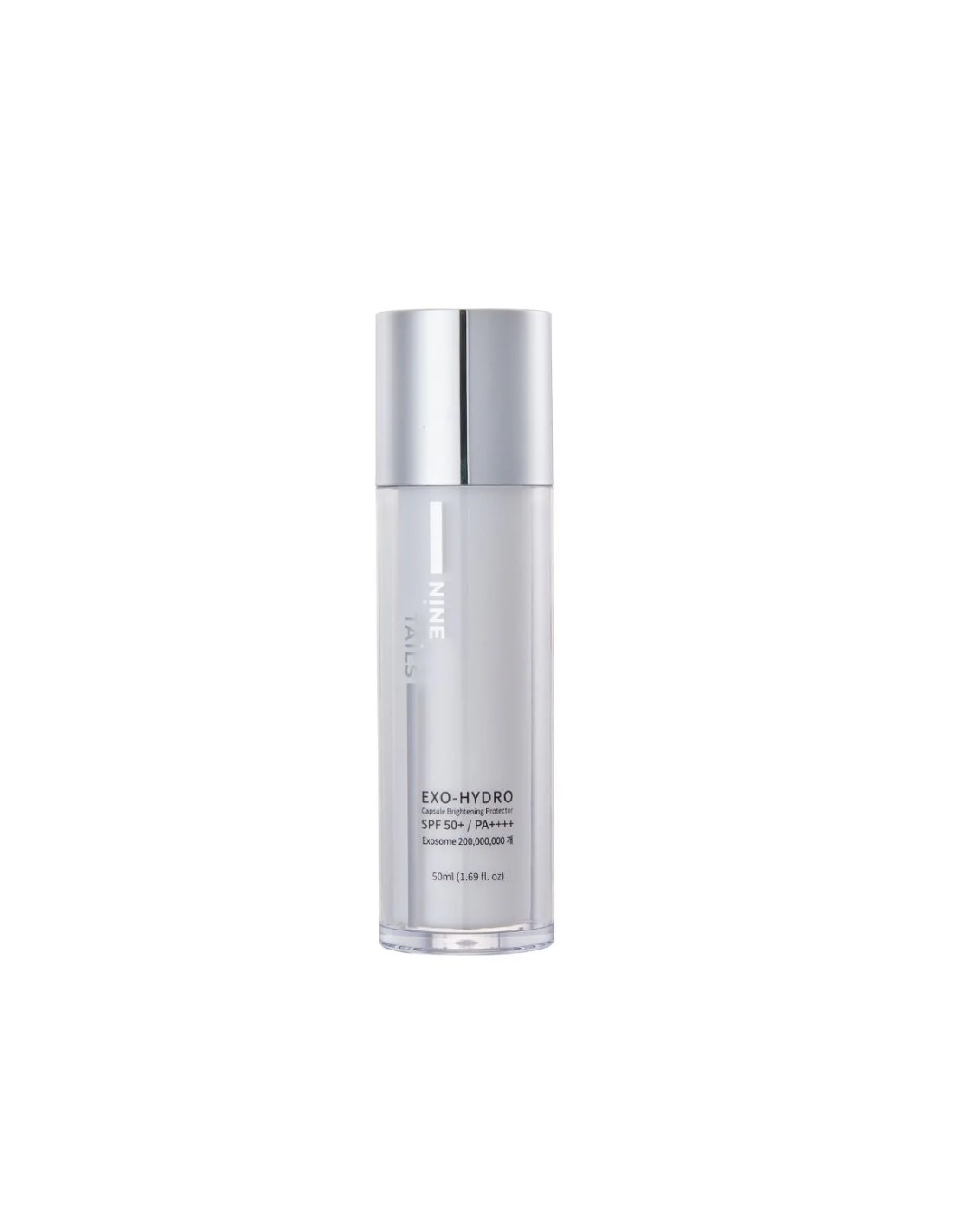 NINE TAILS Exo-Hydro Capsule Brightening Protector SPF 50+ PA++++ es una crema de tratamiento facial avanzada que combina protección solar de amplio espectro con cuidado antiedad. Formulada con exosomas de centella asiática, ceramidas, colágeno, elastina, ácido hialurónico, niacinamida y un complejo de 12 vitaminas, esta crema ayuda a hidratar, iluminar y proteger la piel de los rayos UV y la luz azul. Su tecnología de exosomas permite que los activos lleguen a las capas profundas de la piel, estimulando la producción de colágeno y elastina, mejorando la firmeza y reduciendo arrugas. Aporta un acabado natural, luminoso y ligero, ideal para todo tipo de piel.