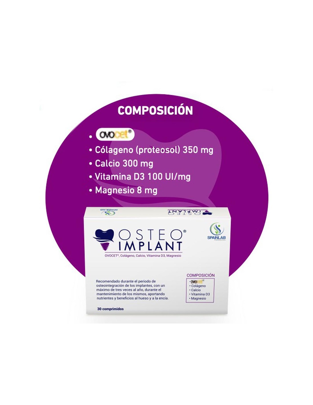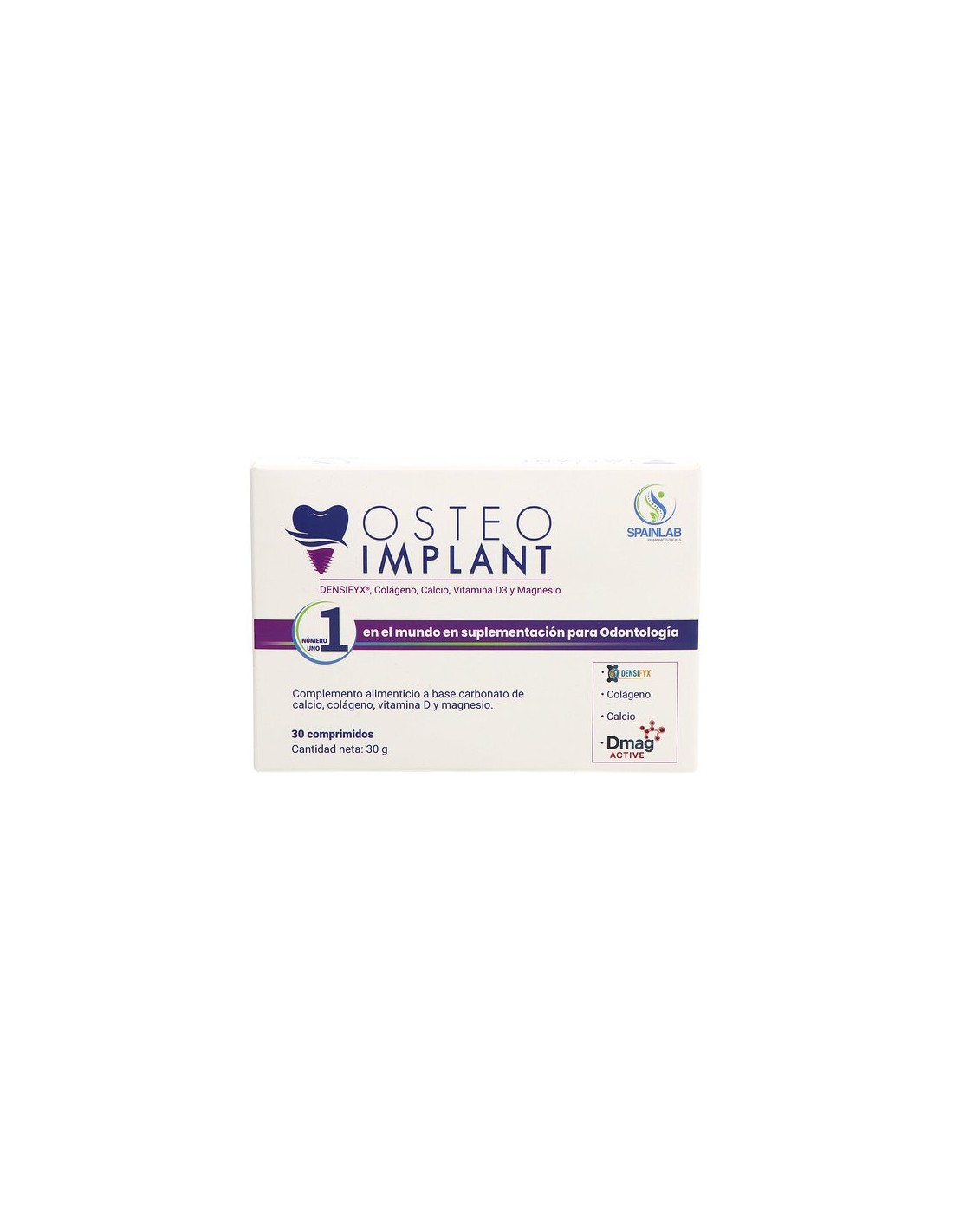 Osteoimplant es un complemento alimenticio de Spainlab indicado para apoyar la regeneración y mantenimiento de tejidos óseos y de encías. Está especialmente recomendado durante el periodo de osteointegración tras la colocación de implantes dentales, así como en cirugías orales, elevación de seno, preparación del tejido óseo o cargas inmediatas. También puede usarse como mantenimiento del hueso y encía hasta 3 veces al año.