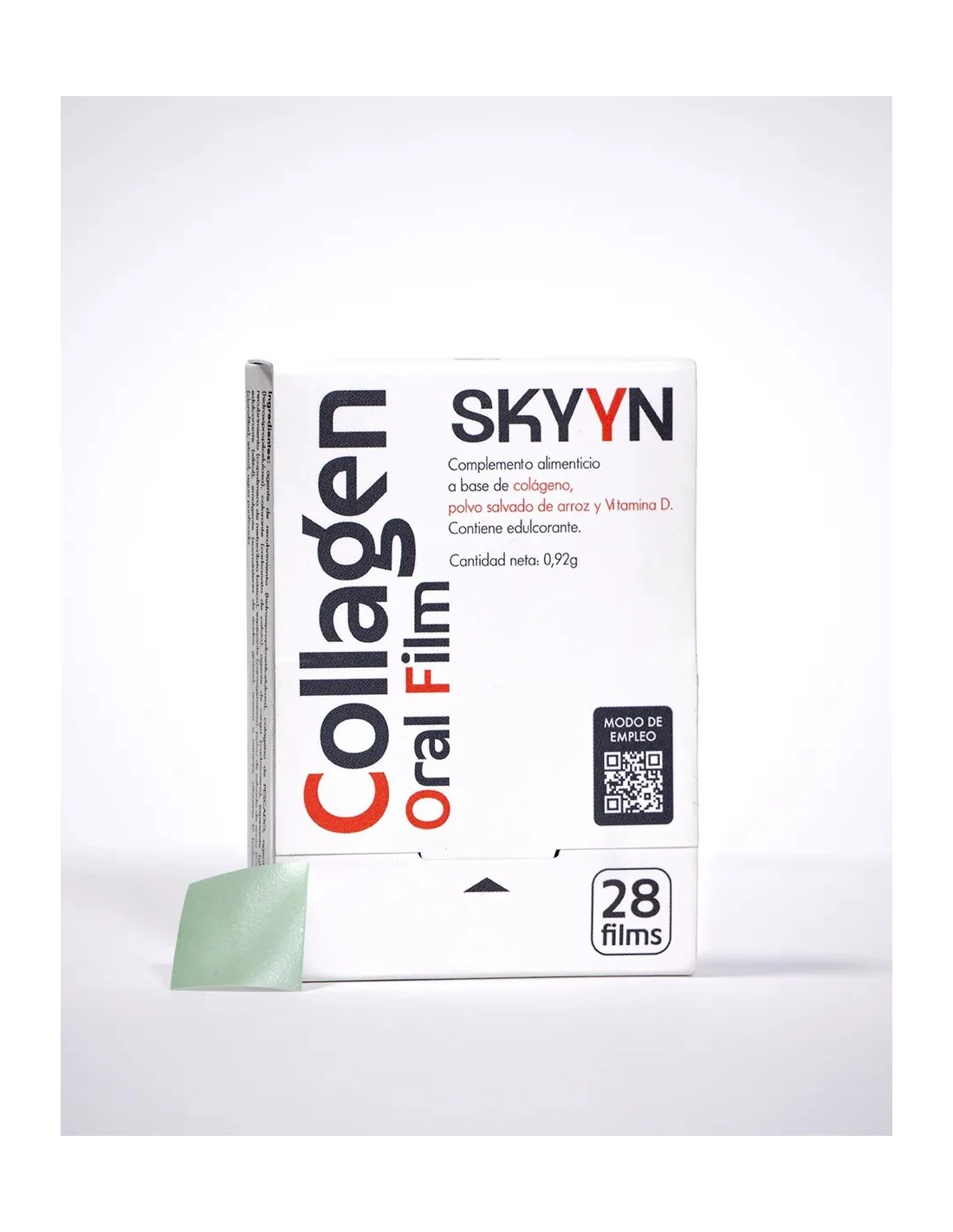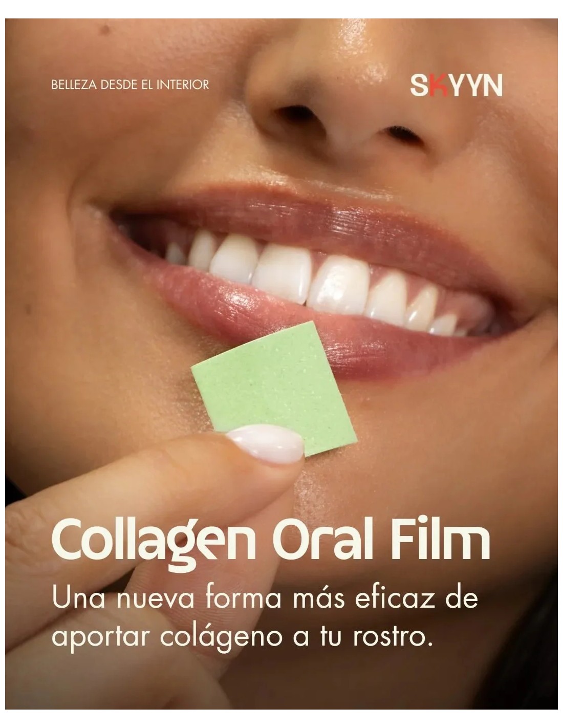 SKYYN Collagen Oral Film es un complemento alimenticio desarrollado por Laboratorios SK que utiliza tecnología coreana patentada en formato de película oral. Está formulado con péptidos de colágeno marino tipo I de bajo peso molecular (1–2 kDa), lo que favorece una alta biodisponibilidad y absorción eficiente a través de la mucosa bucal.