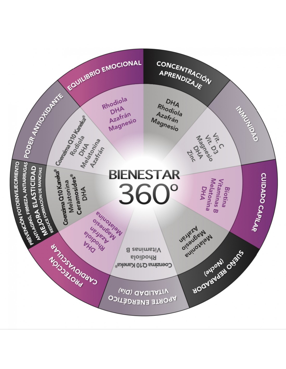 El comprimido de día está orientado a potenciar la energía, la concentración, la función cognitiva y el sistema inmunitario, ayudando a afrontar un ritmo de vida activo y exigente. El comprimido de noche favorece un descanso reparador, la regeneración celular y el cuidado de la piel, actuando sobre los procesos de reparación nocturna del organismo.