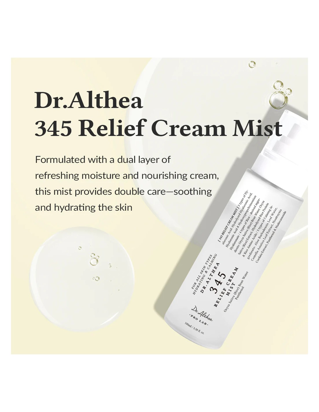 Dr. Althea 345 Relief Cream Mist es una bruma facial de tratamiento que une en una sola fórmula una fase acuosa tipo esencia y una fase cremosa nutritiva. Esta combinación innovadora proporciona hidratación profunda y confort inmediato sin sensación pesada, ayudando a equilibrar la piel sensible, seca o irritada.