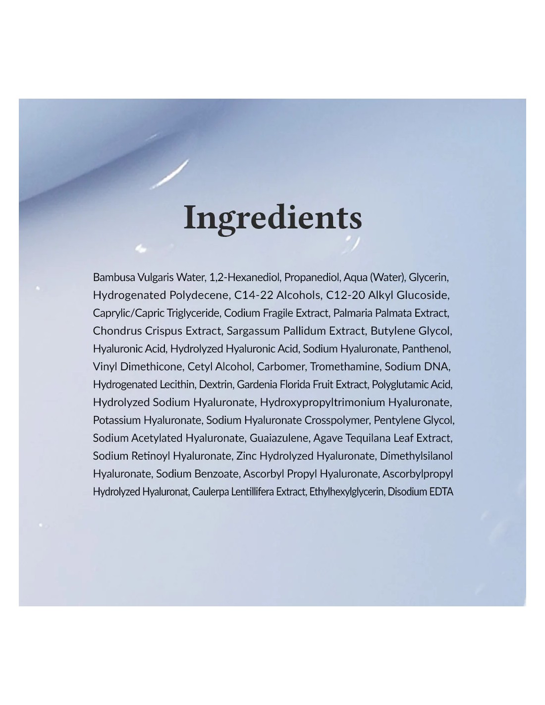 Bambusa Vulgaris Water, 1,2-Hexanediol, Propanediol, Water, Glycerin, Hydrogenated Polydecene, C14-22 Alcohols, C12-20 Alkyl Glucoside, Caprylic/Capric Triglyceride, Codium Fragile Extract, Palmaria Palmata Extract, Chondrus Crispus Extract, Sargassum Pallidum Extract, Butylene Glycol, Hyaluronic Acid, Hydrolyzed Hyaluronic Acid, Sodium Hyaluronate, Panthenol, Vinyl Dimethicone, Cetyl Alcohol, Carbomer, Tromethamine, Sodium DNA, Hydrogenated Lecithin, Dextrin, Gardenia Florida Fruit Extract, Polyglutamic Acid, Hydrolyzed Sodium Hyaluronate, Hydroxypropyltrimonium Hyaluronate, Potassium Hyaluronate, Sodium Hyaluronate Crosspolymer, Pentylene Glycol, Sodium Acetylated Hyaluronate, Guaiazulene, Agave Tequilana Leaf Extract, Sodium Retinoyl Hyaluronate, Zinc Hydrolyzed Hyaluronate, Dimethylsilanol Hyaluronate, Sodium Benzoate, Ascorbyl Propyl Hyaluronate, Ascorbylpropyl Hydrolyzed Hyaluronat, Caulerpa Lentillifera Extract, Ethylhexylglycerin, Disodium EDTA