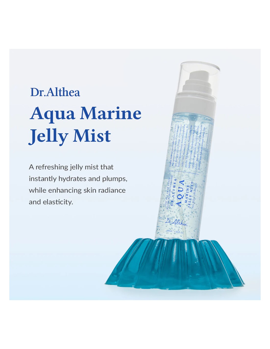 Dr. Althea Aqua Marine Jelly Mist es una bruma facial vegana de nueva generación diseñada para hidratar intensamente, refrescar y aportar un acabado elástico y luminoso tipo “glass skin”. Su fórmula combina PDRN vegano con agua marina profunda, ayudando a mejorar la hidratación, el confort y la vitalidad de la piel.