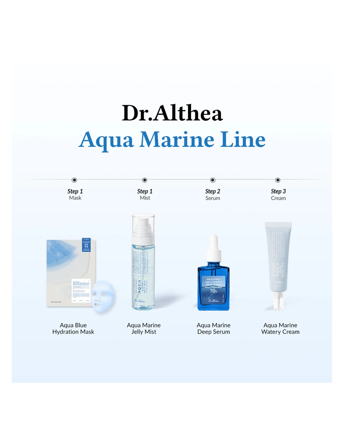 La gama de productos es amplia e incluye, entre otros, productos de limpieza, mascarillas faciales, tónicos, esencias, sueros, cremas, productos de maquillaje básicos y Kit de cuidado de la piel. Dr. Althea tiene una serie de productos más vendidos como Cica Skin Calming Toner, 345 Relief Cream, To Be Youthful Eye Serum, Skin Relief Essence y Vitamin C Boosting Serum.