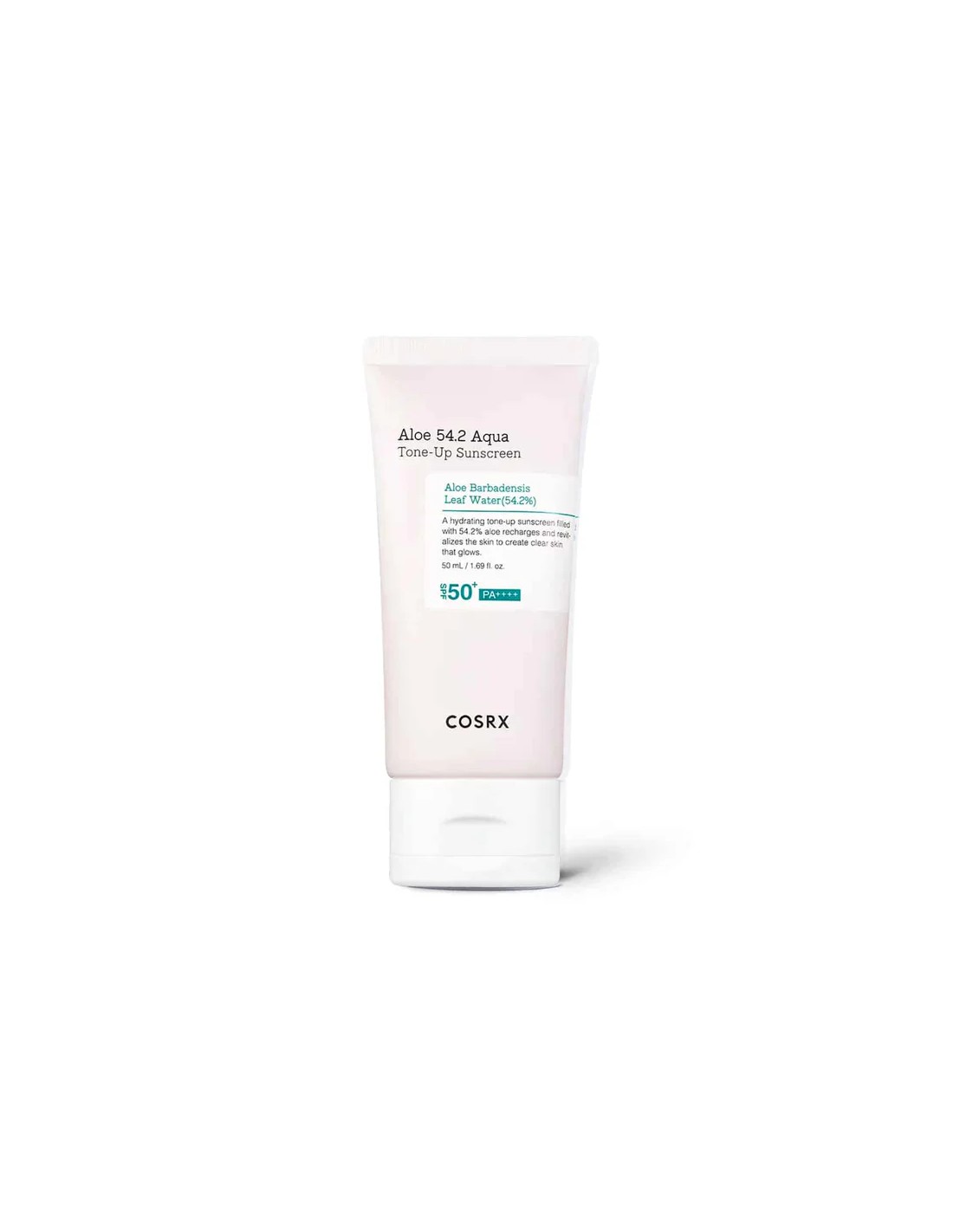El Aloe 54.2 Aqua Tone-Up Sunscreen de COSRX es un protector solar de uso diario que combina alta protección solar con beneficios de tratamiento para la piel. Su fórmula contiene un 54,2% de agua de hoja de aloe vera, que ayuda a hidratar, calmar y aliviar la piel expuesta al sol.