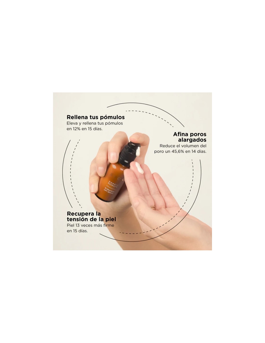 Se combina con un complejo regenerador de la matriz extracelular que activa las vías responsables de la producción de colágeno y elastina, junto con colágeno biomimético fraccionado que aporta firmeza, soporte y un efecto alisador inmediato.