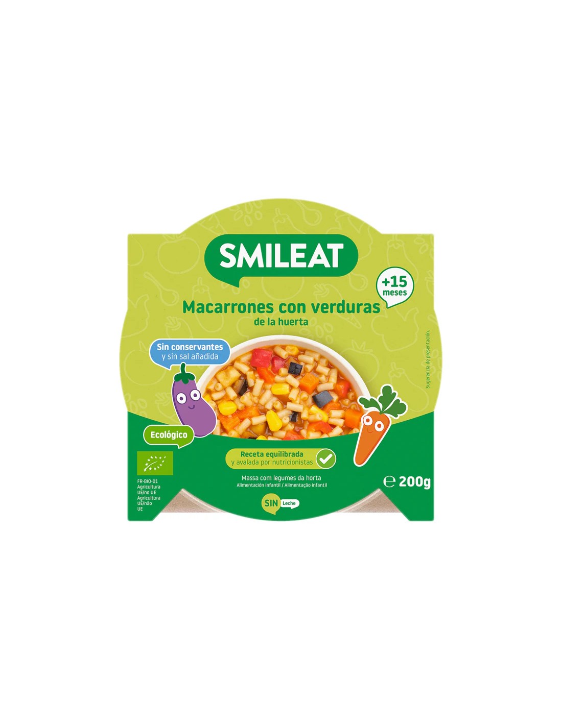 El Platito de Macarrones con Verduras de la Huerta de SMILEAT es una receta casera y equilibrada, pensada para la alimentación infantil a partir de los 15 meses. Elaborado con ingredientes ecológicos de alta calidad, combina pasta cocida con una cuidada selección de verduras como zanahoria, berenjena, pimiento, maíz y tomate.