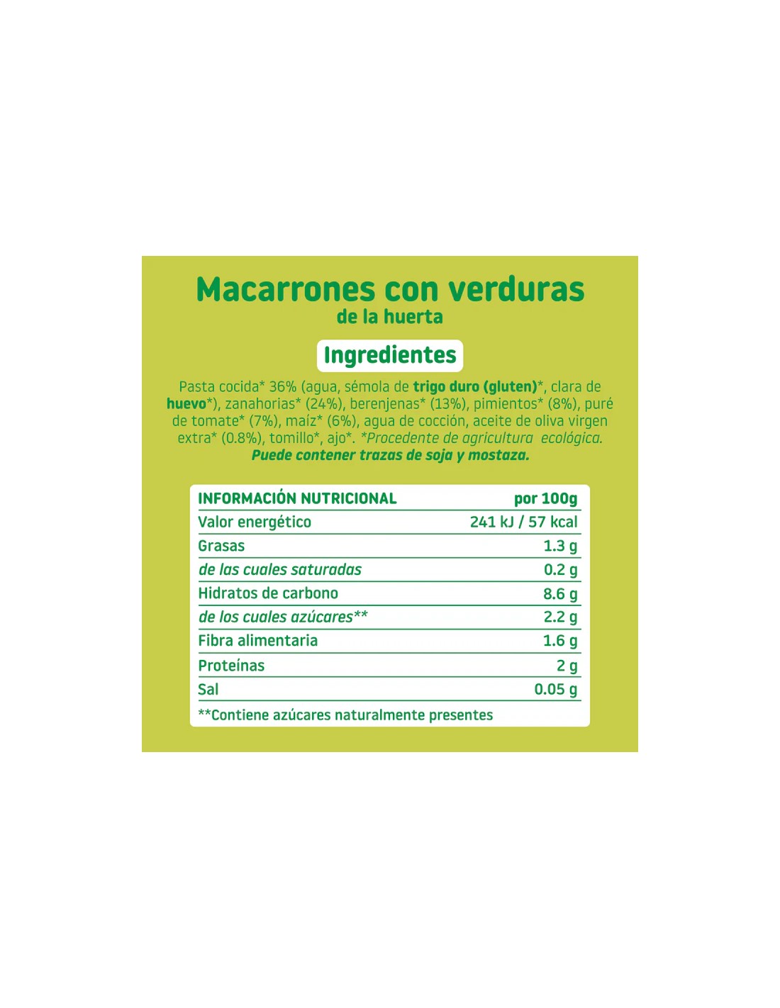 Pasta cocida* 36% (agua, sémola de trigo duro (gluten), clara de huevo), zanahorias* 24%, berenjenas* 13%, pimientos* 8%, puré de tomate* 7%, maíz* 6%, agua de cocción, aceite de oliva virgen extra* 0,8%, tomillo*, ajo*.