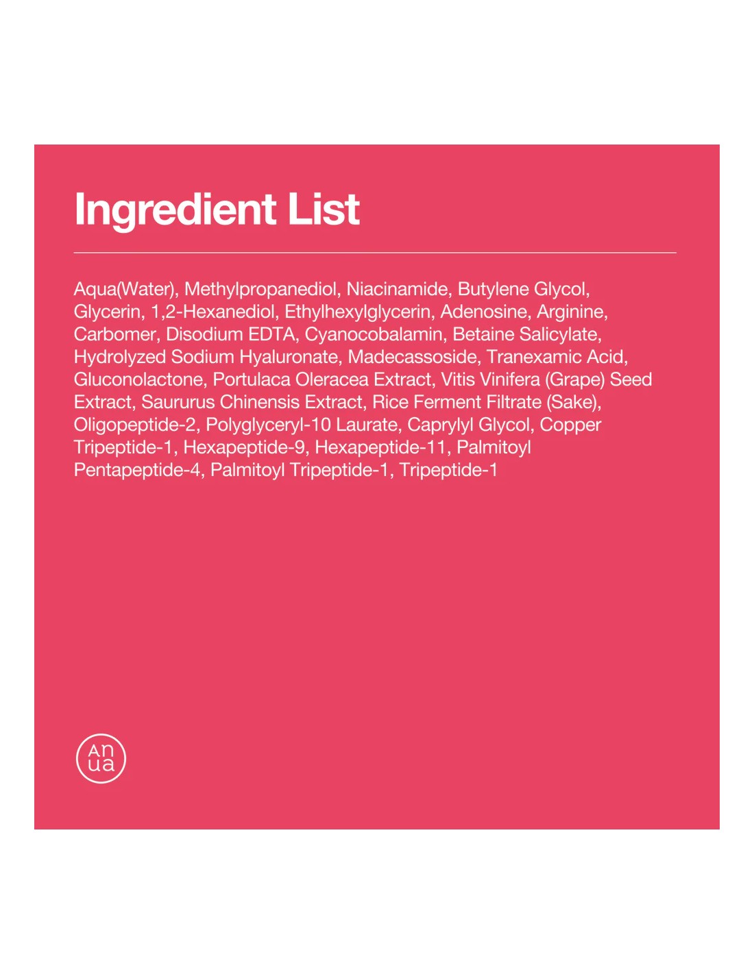 Water, Butylene Glycol, Glycereth-26, Niacinamide, Glycerin, Hydroxyethyl Urea, 1,2-Hexanediol, Hydrolyzed Collagen, Terminalia Ferdinandiana Fruit Extract, Diethoxyethyl Succinate, Hydroxyacetophenone, Glycosyl Trehalose, Hydrogenated Starch Hydrolysate, Melia Azadirachta Leaf Extract, Melia Azadirachta Flower Extract, Coccinia Indica Fruit Extract, Aloe Barbadensis Flower Extract, Solanum Melongena Fruit Extract, Ocimum Sanctum Leaf Extract, Corallina Officinalis Extract, Curcuma Longa Root Extract, Propanediol, Hyaluronic Acid, Sodium Hyaluronate, Adenosine, Collagen Extract, Sodium DNA, Oligopeptides.