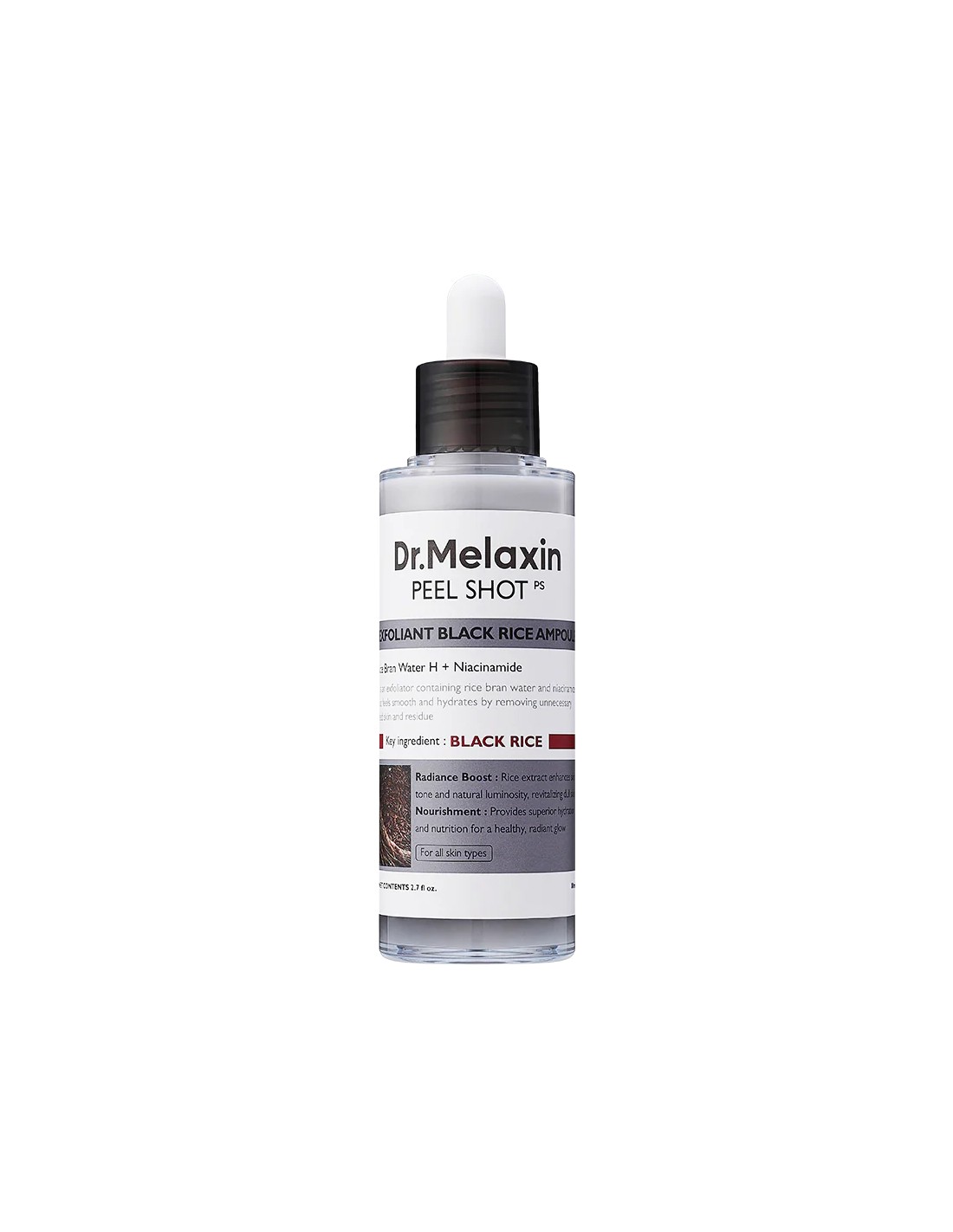 Peel Shot Glow Black Rice Ampoule de Dr.Melaxin es una ampolla exfoliante diseñada para ayudar a refinar la textura de la piel y mejorar su aspecto luminoso. Su fórmula combina agentes exfoliantes suaves con extractos derivados del arroz negro, proporcionando una exfoliación eficaz y respetuosa con la piel.