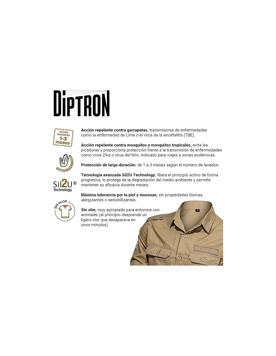 DIPTRÓN® TEXTIL REPELLENT es un repelente para aplicación exclusiva sobre ropa y textiles, diseñado para proporcionar protección prolongada frente a mosquitos, mosquitos tropicales y garrapatas.