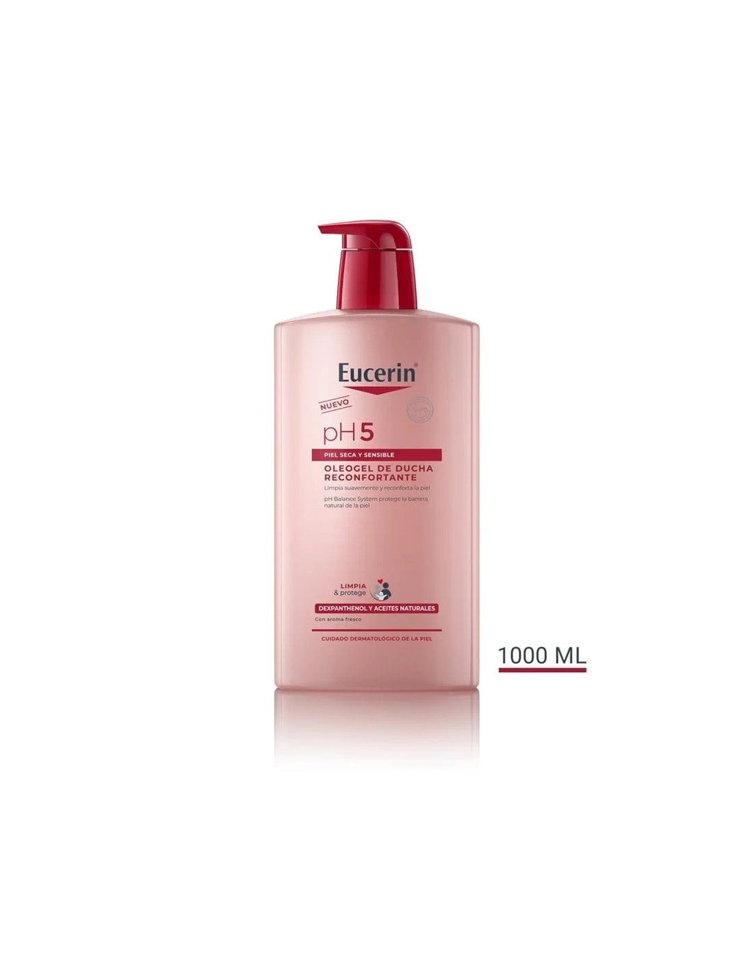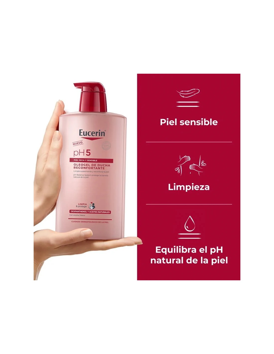 Eucerin pH5 Óleo Gel de Ducha Reconfortante es un limpiador corporal y facial especialmente formulado para piel seca y sensible. Su textura óleo gel limpia con suavidad sin alterar el equilibrio natural cutáneo ni dejar sensación grasa.