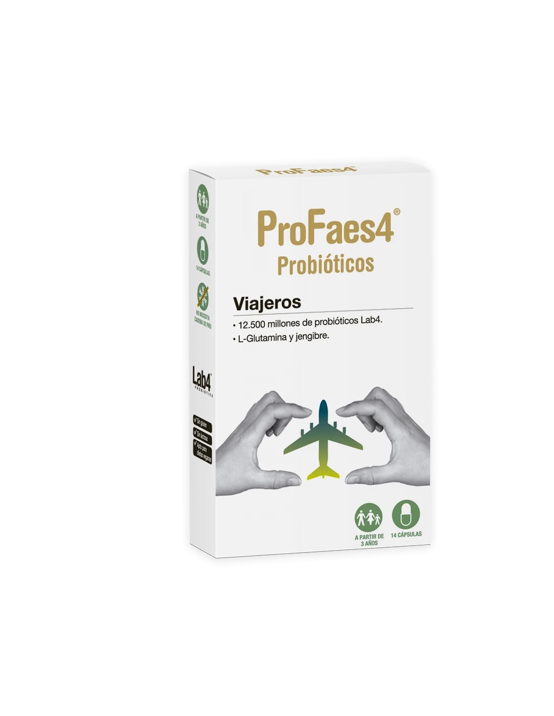 ProFaes4® Viajeros es un complemento alimenticio que combina probióticos del consorcio Lab4 con L-glutamina y jengibre, especialmente formulado para acompañar periodos de cambios en la alimentación, horarios o rutinas, como los viajes.