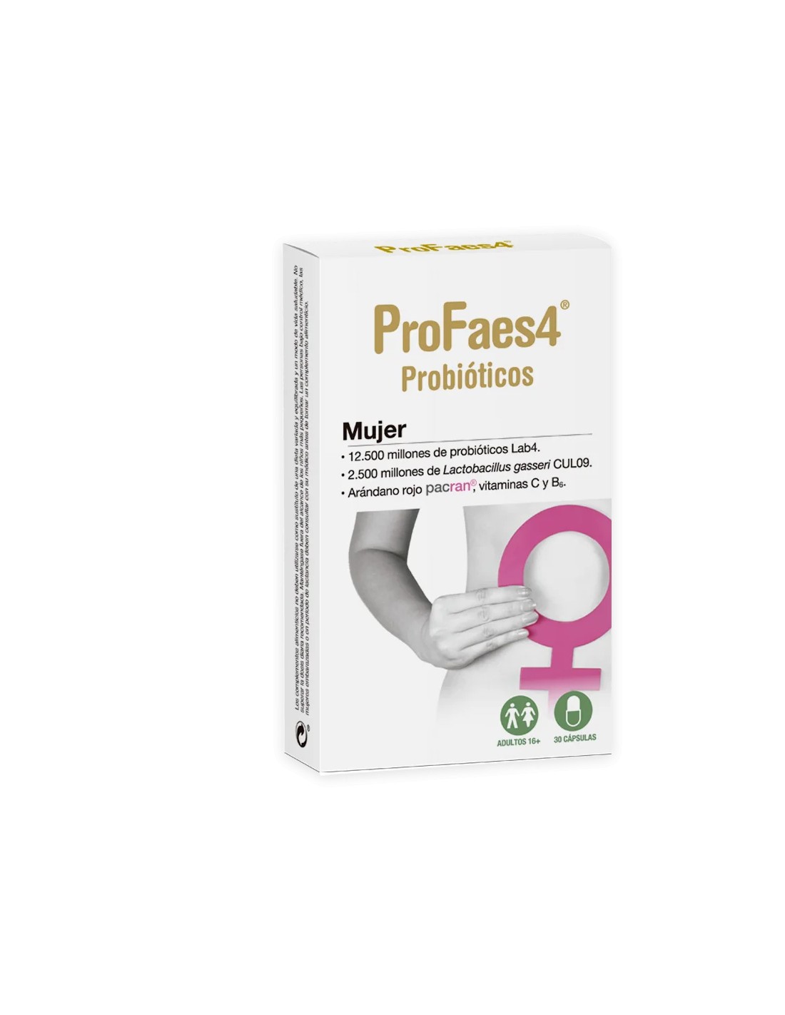 ProFaes4® Mujer combina el consorcio Lab4®, una mezcla de cuatro cepas probióticas cuidadosamente seleccionadas (Lactobacillus acidophilus CUL-60 y CUL-21, Bifidobacterium bifidum CUL-20 y Bifidobacterium animalis subsp. lactis CUL-34), junto con Lactobacillus gasseri CUL-09, una cepa presente de forma habitual en la microbiota vaginal normal. Esta formulación se complementa con arándano rojo pacran®, un extracto patentado obtenido de la fruta completa de Vaccinium macrocarpon, estandarizado en proantocianidinas (PACs) y que conserva otros compuestos naturales del arándano.