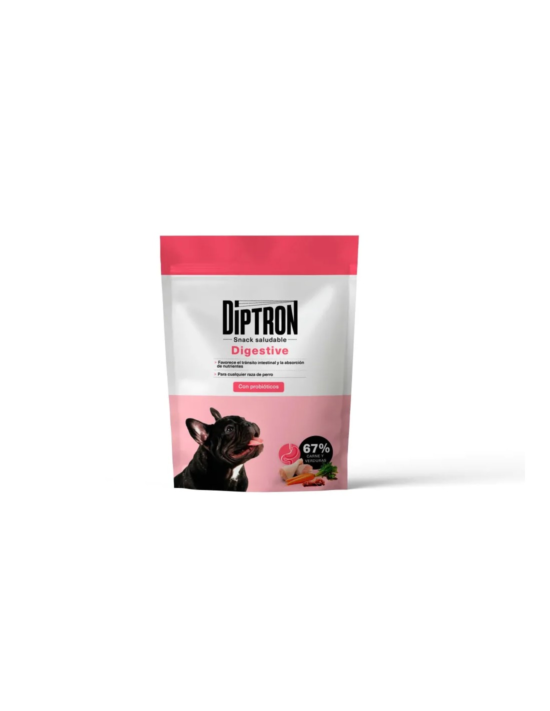 Diptron Snack Saludable Digestive es un alimento complementario semi-húmedo para perros de todas las razas y tamaños, formulado para apoyar el equilibrio digestivo y favorecer el tránsito intestinal. Incorpora proteínas de alta calidad procedentes de carne de pollo y jamón serrano, combinadas con arroz y vegetales seleccionados.