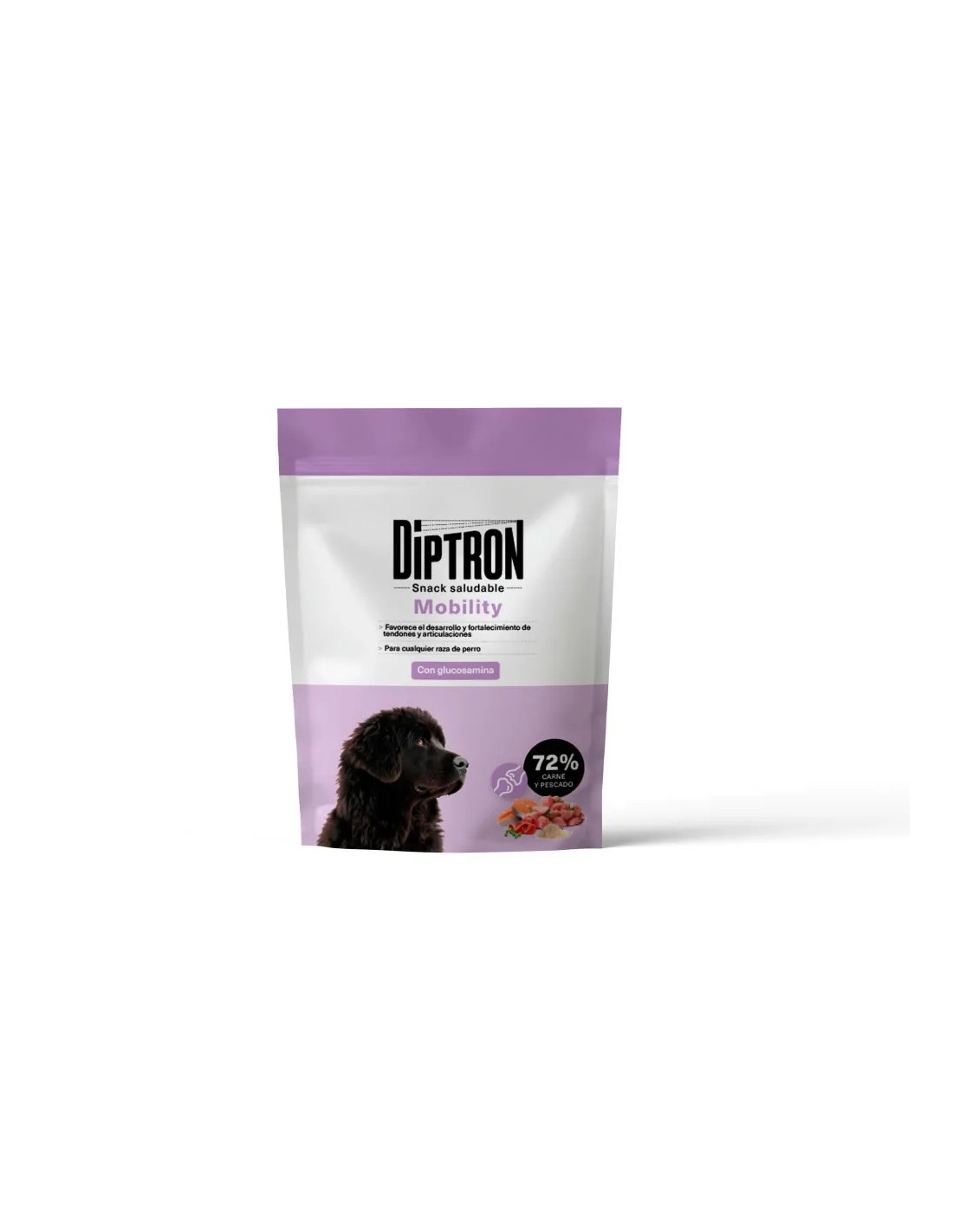 Diptron Snack Mobility es un alimento complementario semi-húmedo diseñado para apoyar la salud de tendones y articulaciones en perros de todas las razas. Su fórmula combina proteínas de alta calidad provenientes de carne de pollo, jamón serrano y salmón, junto con arroz y vegetales seleccionados para una digestión óptima.
