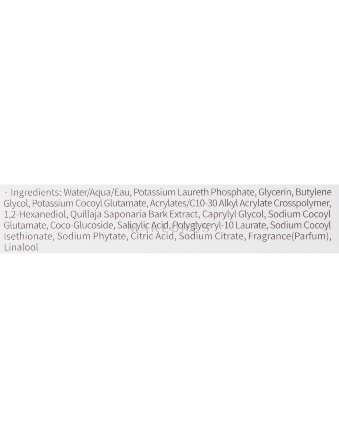 Water, Potassium Laureth Phosphate, Glycerin, Butylene Glycol, Potassium Cocoyl Glutamate, Acrylates/C10-30 Alkyl Acrylate Crosspolymer, 1,2-Hexanediol, Quillaja Saponaria Bark Extract, Caprylyl Glycol, Sodium Cocoyl Glutamate, Coco-Glucoside, Salicylic Acid, Polyglyceryl-10 Laurate, Sodium Cocoyl Isethionate, Sodium Phytate, Citric Acid, Sodium Citrate, Fragrance (Parfum).