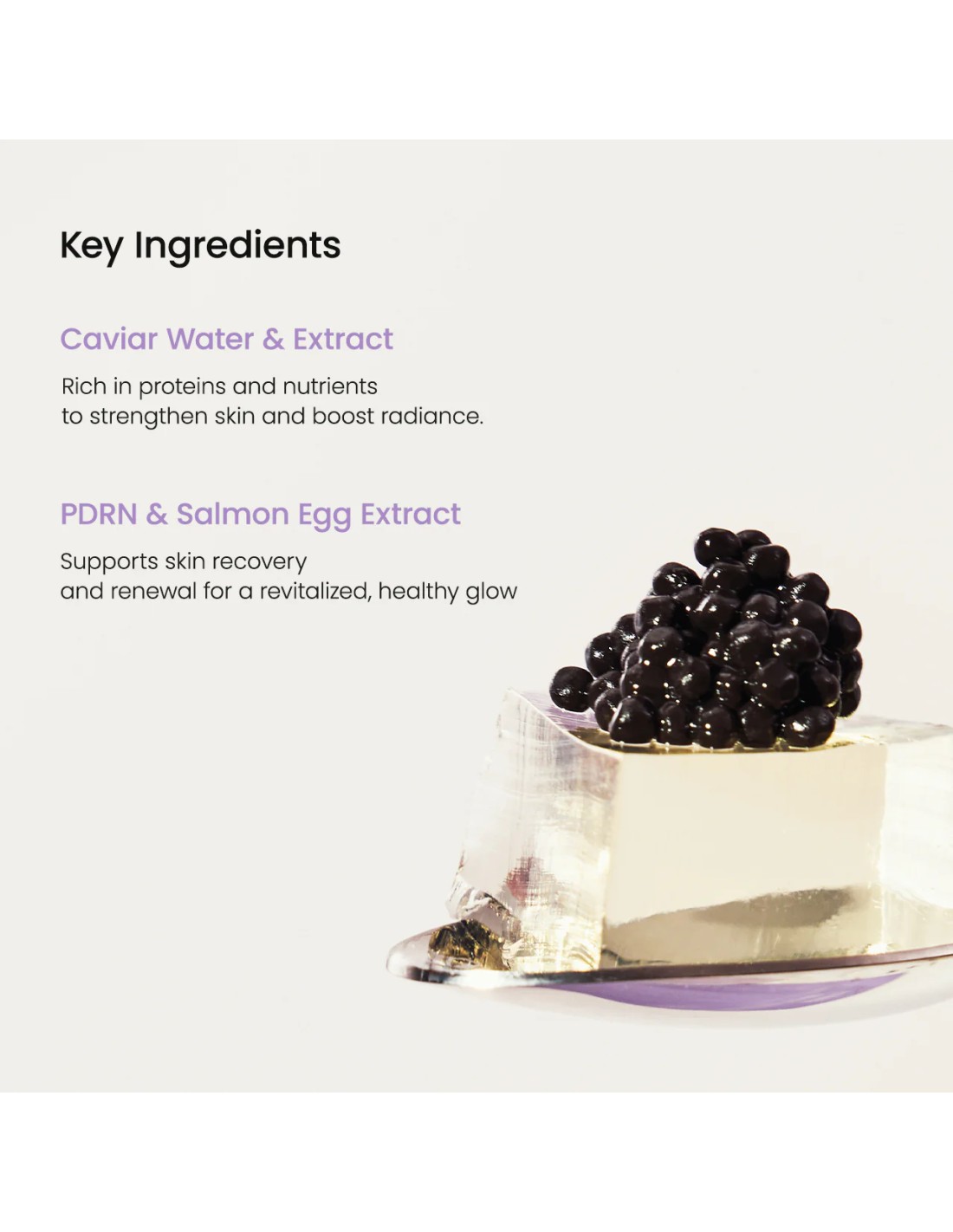 Caviar Water, Water, Glycerin, Dipropylene Glycol, Cetyl Ethylhexanoate, 1,2-Hexanediol, Niacinamide, Propylene Glycol Dibenzoate, Chondrus Crispus Extract, Ceratonia Siliqua (Carob) Gum, Butyrospermum Parkii (Shea) Butter, Hydroxyacetophenone, Polyglyceryl-3 Methylglucose Distearate, Potassium Chloride, Algin, Chondrus Crispus Powder, Polyacrylate-13, Allantoin, Glyceryl Stearate, Cellulose Gum, Glucomannan, Xanthan Gum, Ethylhexyl Olivate, Eclipta Prostrata Extract, Sucrose, Ethylhexylglycerin, Hydrogenated Polyisobutene, Sodium Acrylates Copolymer, Sodium Polyacryloyldimethyl Taurate, Adenosine, Melia Azadirachta Leaf Extract, Sodium Phytate, Polyglyceryl-4 Oleate, Polyglyceryl-10 Laurate, Ethylhexyl Palmitate, Melia Azadirachta Flower Extract, Pyrus Communis (Pear) Fruit Extract, Sorbitan Isostearate, Rosa Damascena Flower Water, Sodium Polyacrylate, Coccinia Indica Fruit Extract, Caviar Extract, Salmon Egg Extract, Iris Florentina Root Extract, Cucumis Melo (Melon) Fruit Extract, Moringa Oleifera Seed Oil, Hedera Helix (Ivy) Leaf/Stem Extract, Solanum Melongena (Eggplant) Fruit Extract, Aloe Barbadensis Flower Extract, Simmondsia Chinensis (Jojoba) Seed Oil, Ocimum Sanctum Leaf Extract, Curcuma Longa (Turmeric) Root Extract, Corallina Officinalis Extract, Tocopherol, Sodium DNA