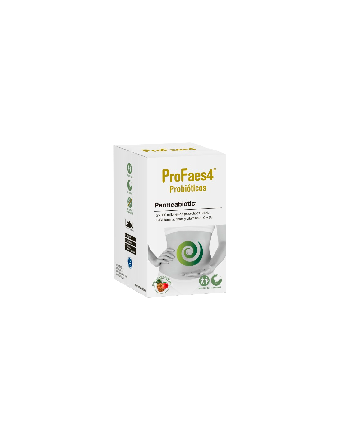 ProFaes4® Permeabiotic es un complemento alimenticio simbiótico avanzado diseñado para mantener el equilibrio de la microbiota intestinal y reforzar la barrera digestiva. Combina probióticos del consorcio Lab4, prebióticos (fructooligosacáridos e inulina), L-glutamina y vitaminas A, C y D3, que contribuyen al funcionamiento normal del sistema inmunitario, al mantenimiento de las mucosas en condiciones normales y al bienestar digestivo general.