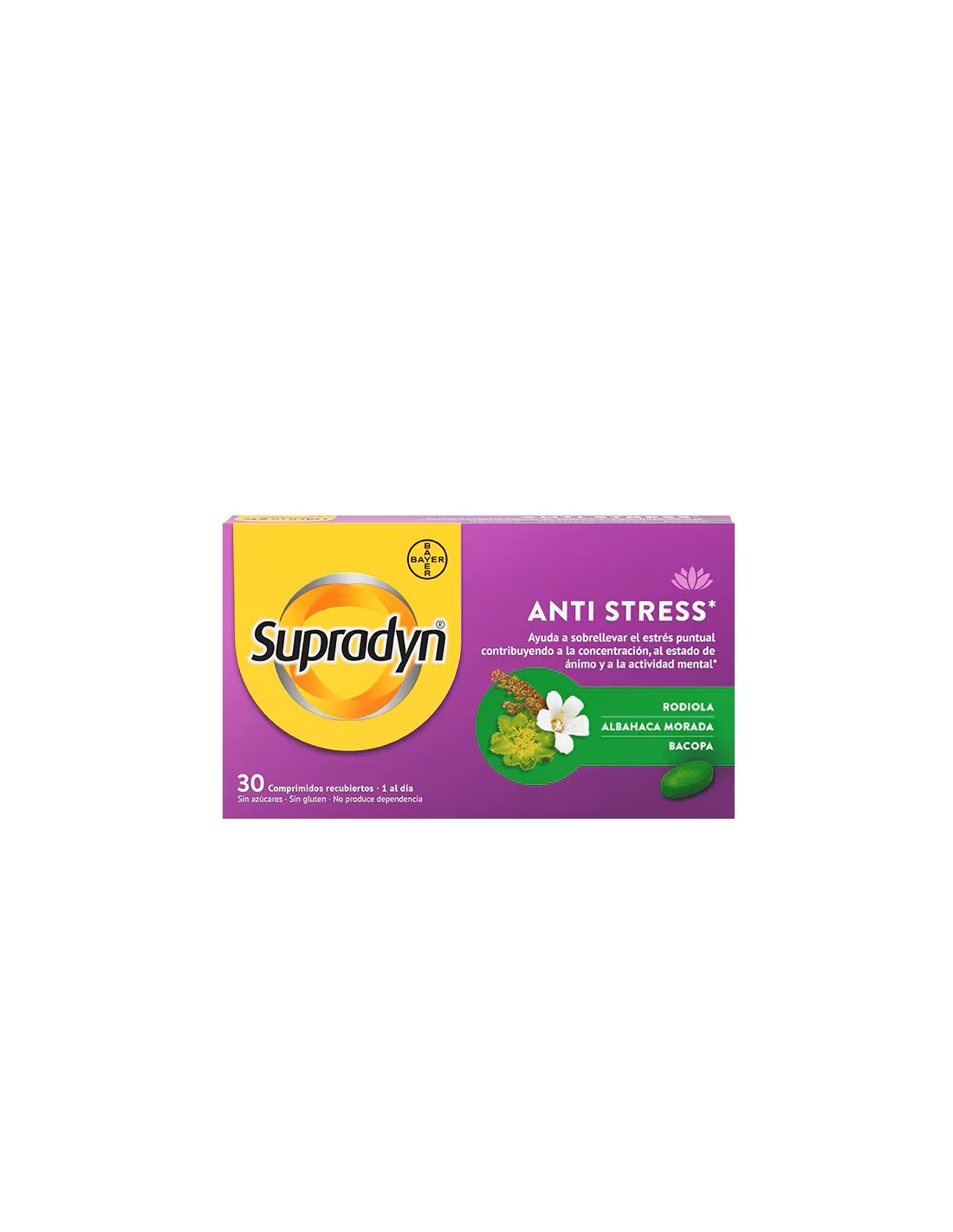 Supradyn Anti Stress es un complemento alimenticio formulado para ayudar a afrontar situaciones de estrés puntual, nerviosismo o falta de concentración, favoreciendo el bienestar mental y el rendimiento cognitivo.