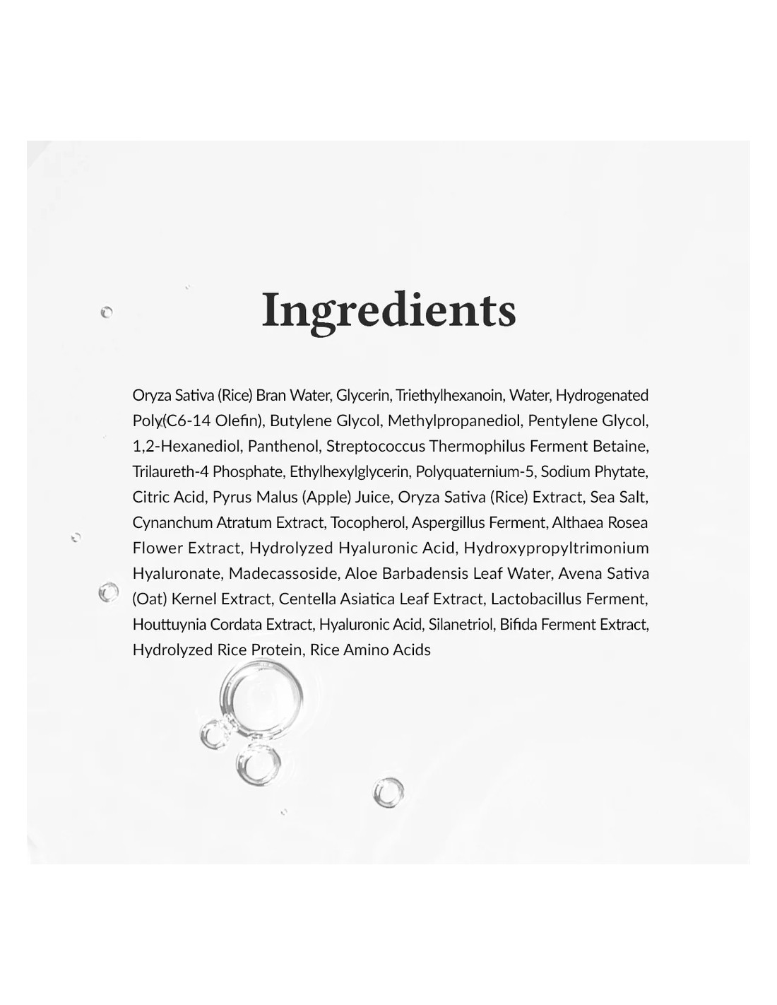 Oryza Sativa (Rice) Bran Water, 1,2-Hexanediol, Triethylhexanoin, Glycerin, Hydrogenated Poly(C6-14 Olefin), Tocopherol, Water, Butylene Glycol, Methylpropanediol, Pentylene Glycol, Streptococcus Thermophilus Ferment, Pyrus Malus (Apple) Juice, Panthenol, Hydrolyzed Hyaluronic Acid, Polyquaternium-51, Betaine, Trilaurate-4 Phosphate, Cynanchum Atratum Extract, Althaea Rosea Flower Extract, Oryza Sativa (Rice) Extract, Sea Salt, Aspergillus Ferment, Sodium Phytate, Citric Acid, Madecassoside, Hydroxypropyltrimonium Hyaluronate, Centella Asiatica Leaf Extract, Houttuynia Cordata Extract, Aloe Barbadensis Leaf Water, Bifida Ferment Extract, Hyaluronic Acid, Silanetriol, Avena Sativa (Oat) Kernel Extract, Lactobacillus Ferment, Hydrolyzed Rice Protein, Rice Amino Acids