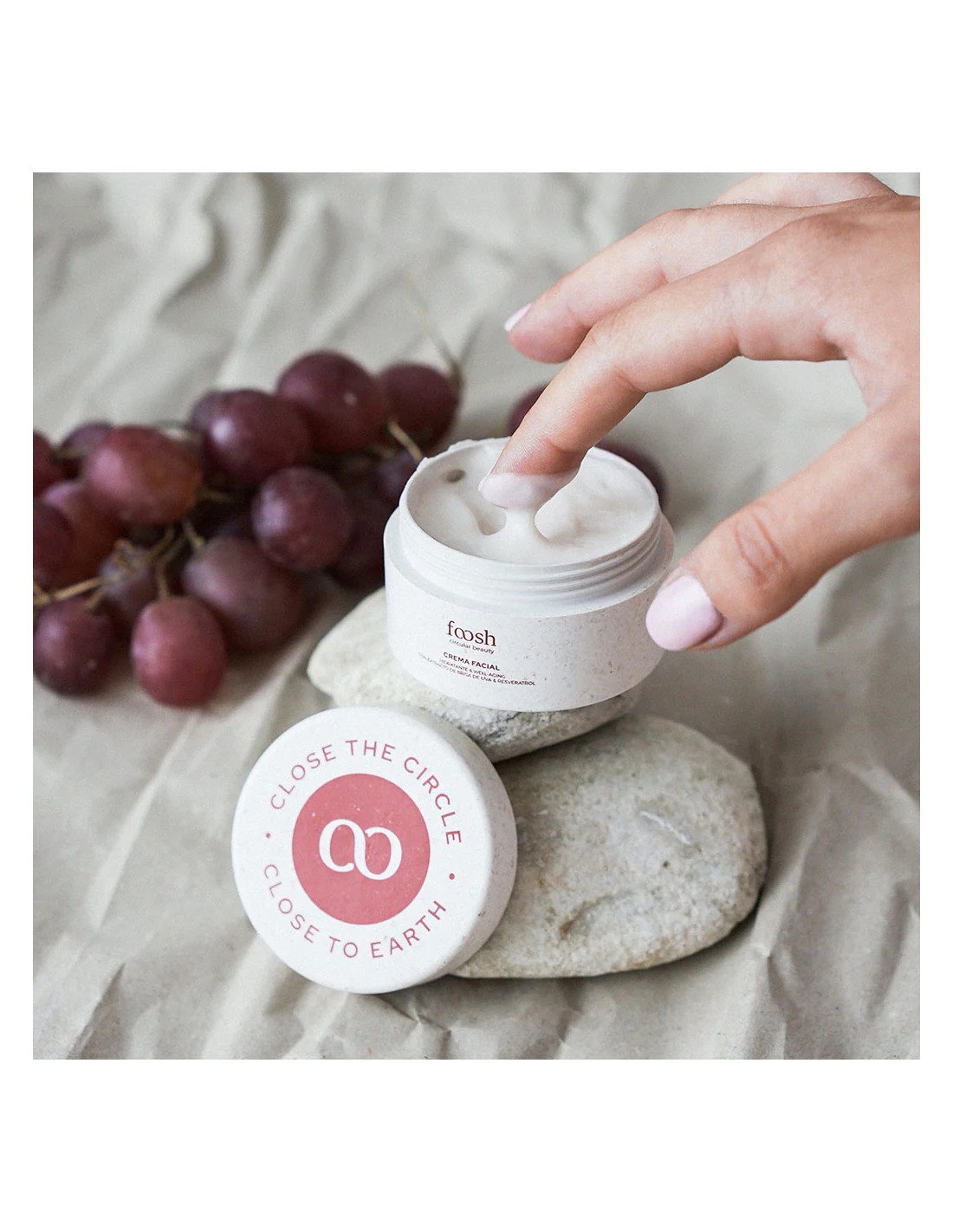 La crema facial Foosh aprovecha las propiedades naturales de la uva para proporcionar hidratación y nutrición a la piel de forma suave y equilibrada.