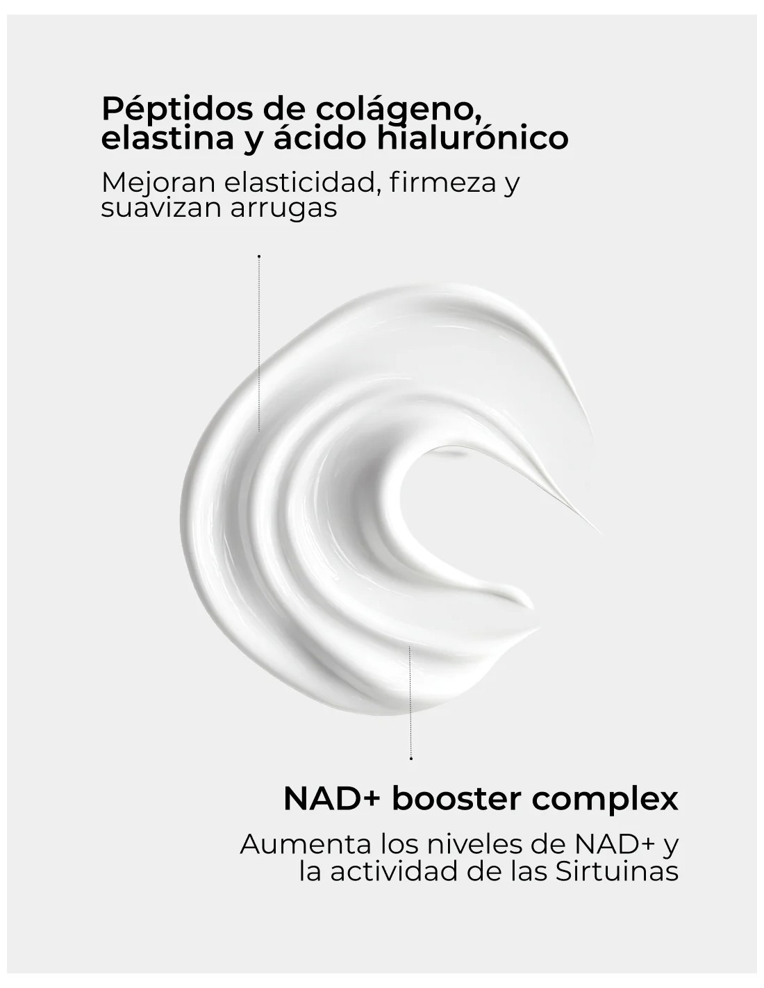 La fórmula incorpora activos que contribuyen a optimizar la apariencia de la piel y apoyar la actividad celular asociada a los niveles de NAD⁺, una molécula relacionada con los procesos energéticos de la piel. Gracias a esta combinación, la piel puede verse más luminosa, flexible y con aspecto revitalizado.