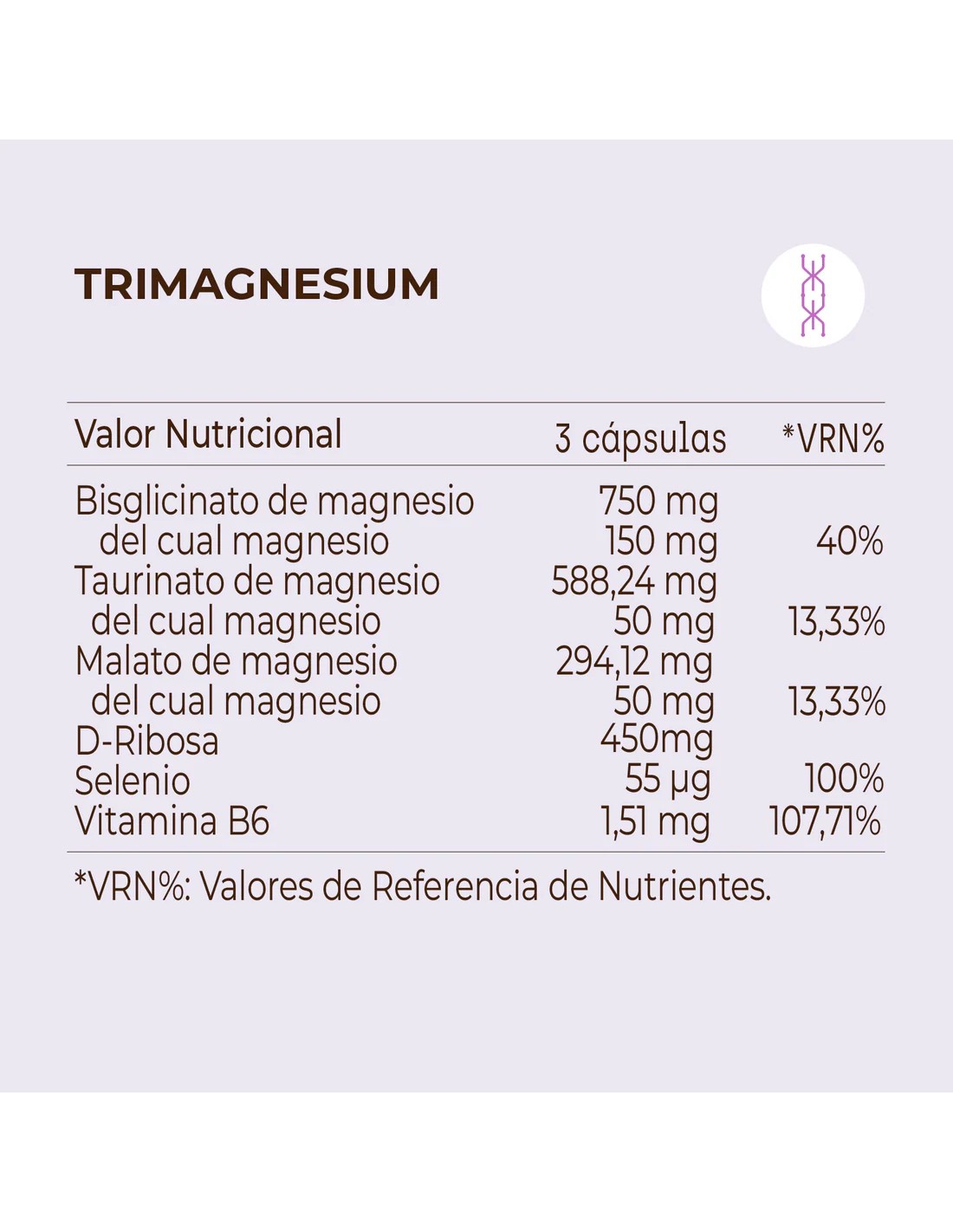 Bisglicinato de magnesio, taurinato de magnesio, D-ribosa, agente de recubrimiento (cápsula: hidroxipropilmetilcelulosa), malato de magnesio, agente de carga (celulosa microcristalina), antiaglomerantes (sal magnésica de ácidos grasos y dióxido de silicio), L-seleniometionina y vitamina B6 (piridoxina clorhidrato).
