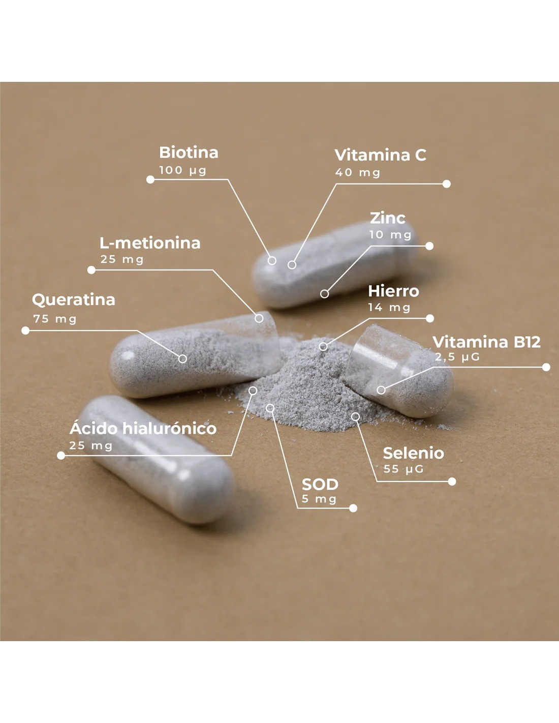 Agente de recubrimiento (hidroxipropilmetilcelulosa), queratina, bisalicinato de hierro, agente endurecedor (celulosa microcristalina), L-cisteína HCL, ácido L-ascórbico (vitamina C), citrato de zina, L-metionina, ácido hialurónico, L-selenometionina, superóxido cismutasa, antiaglomerantes (sales magnésicas de ácidos grasos y dióxido de silicio), metilcobalamina (vitamina B12), D-Biotina (Biotina).