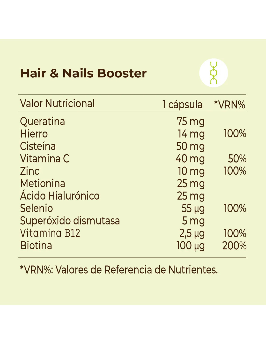 La cantidad de biotina incluida permite alcanzar el Valor Nutricional de Referencia (VRN), contribuyendo de forma eficaz al mantenimiento del cabello, la piel y las uñas en condiciones normales. Además, incorpora ingredientes específicos que actúan de manera sinérgica para potenciar los resultados y ofrecer un enfoque global.
