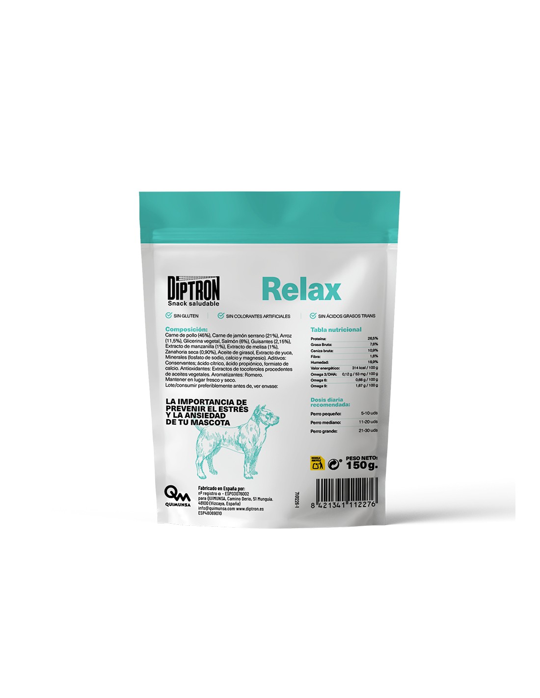 Diptron Snack Saludable Relax es un alimento complementario semi-húmedo para perros de todas las razas y tamaños, formulado para ayudar a combatir estados nerviosos y apoyar el control de la hiperactividad. Incorpora proteínas de alta calidad procedentes de carne de pollo, jamón serrano y salmón, combinadas con arroz y vegetales seleccionados.