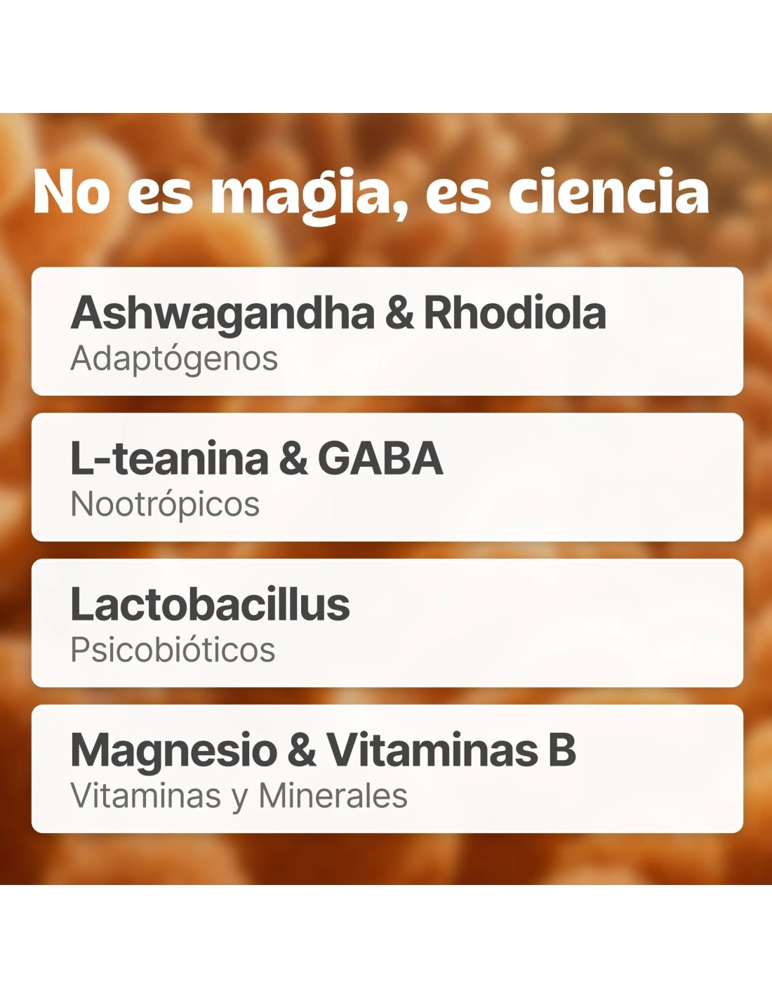 Cacao desgrasado en polvo, algarrobo en polvo, complejo de magnesio [ATA-Mg® (acetil taurato de magnesio) y citrato de magnesio], aromas naturales, Lalmin® B-complex vitamins [levadura inactiva, vitamina B3 (ácido nicotínico), vitamina B1 (clorhidrato de tiamina), vitamina B2 (riboflavina), vitamina B5 (D-pantotenato cálcico), vitamina B6 (clorhidrato de piridoxina), vitamina B7 (D-biotina), vitamina B9 (ácido fólico) y vitamina B12 (cianocobalamina)], rhodiola extracto seco (Rhodiola rosea L., raíz) (≥3% rosavinas, ≥1% salidrósidas), ashwagandha extracto seco (Withania somnifera, raíz) (≥5% withanólidos) (KSM-66®), L-teanina (extraída y aislada de Camellia sinensis, hojas) (≥98% L-teanina), GABA (ácido gamma aminobutírico), Lactobacillus gasseri CP2305 tratado térmicamente, Heyndrickxia coagulans y sal.