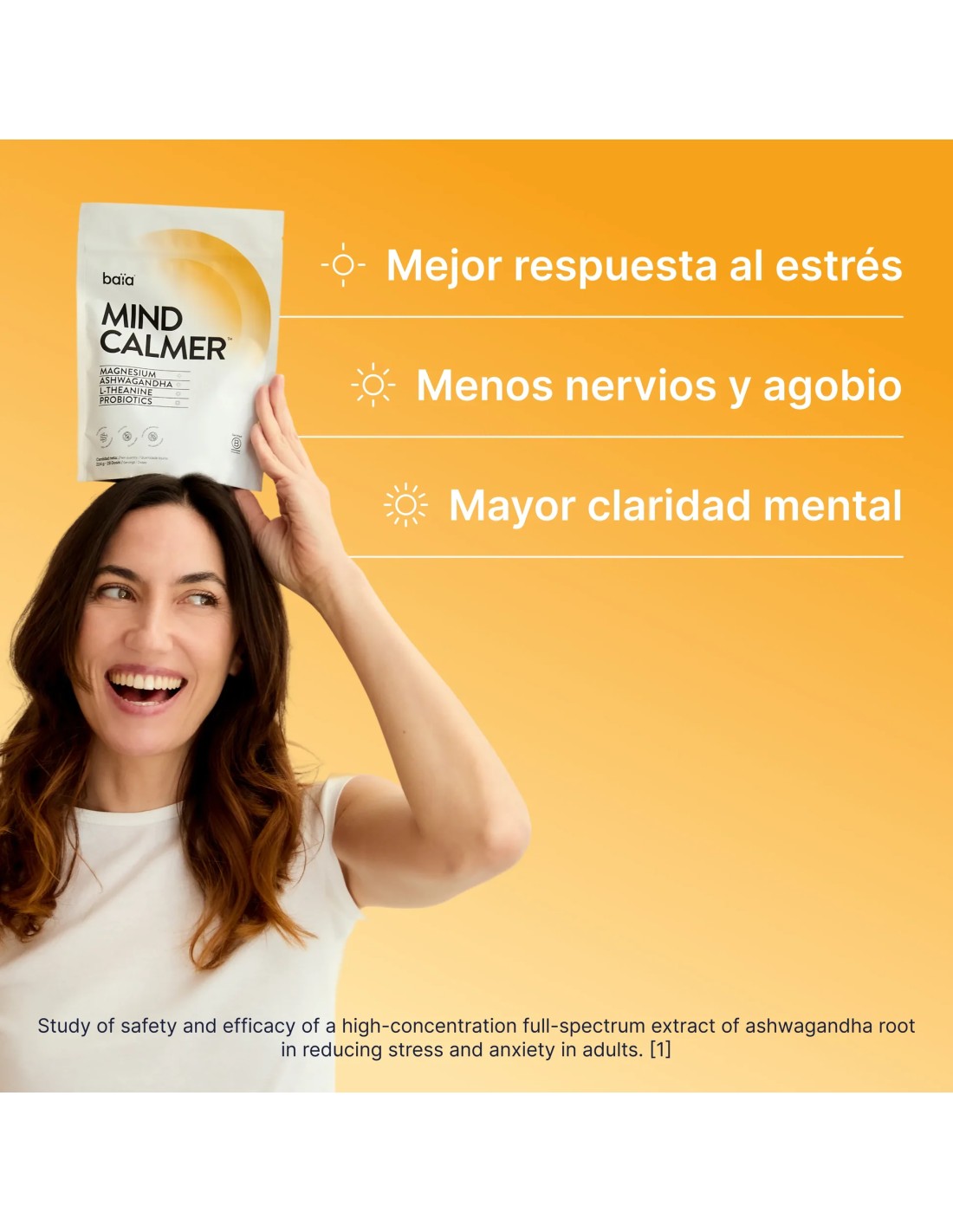 Mind Calmer™ es un complemento alimenticio en polvo formulado para ayudar a modular la respuesta al estrés y favorecer el equilibrio mental y emocional. Su innovadora combinación de ingredientes actúa en sinergia sobre el eje intestino-cerebro, contribuyendo a una mente más clara, serena y resiliente.